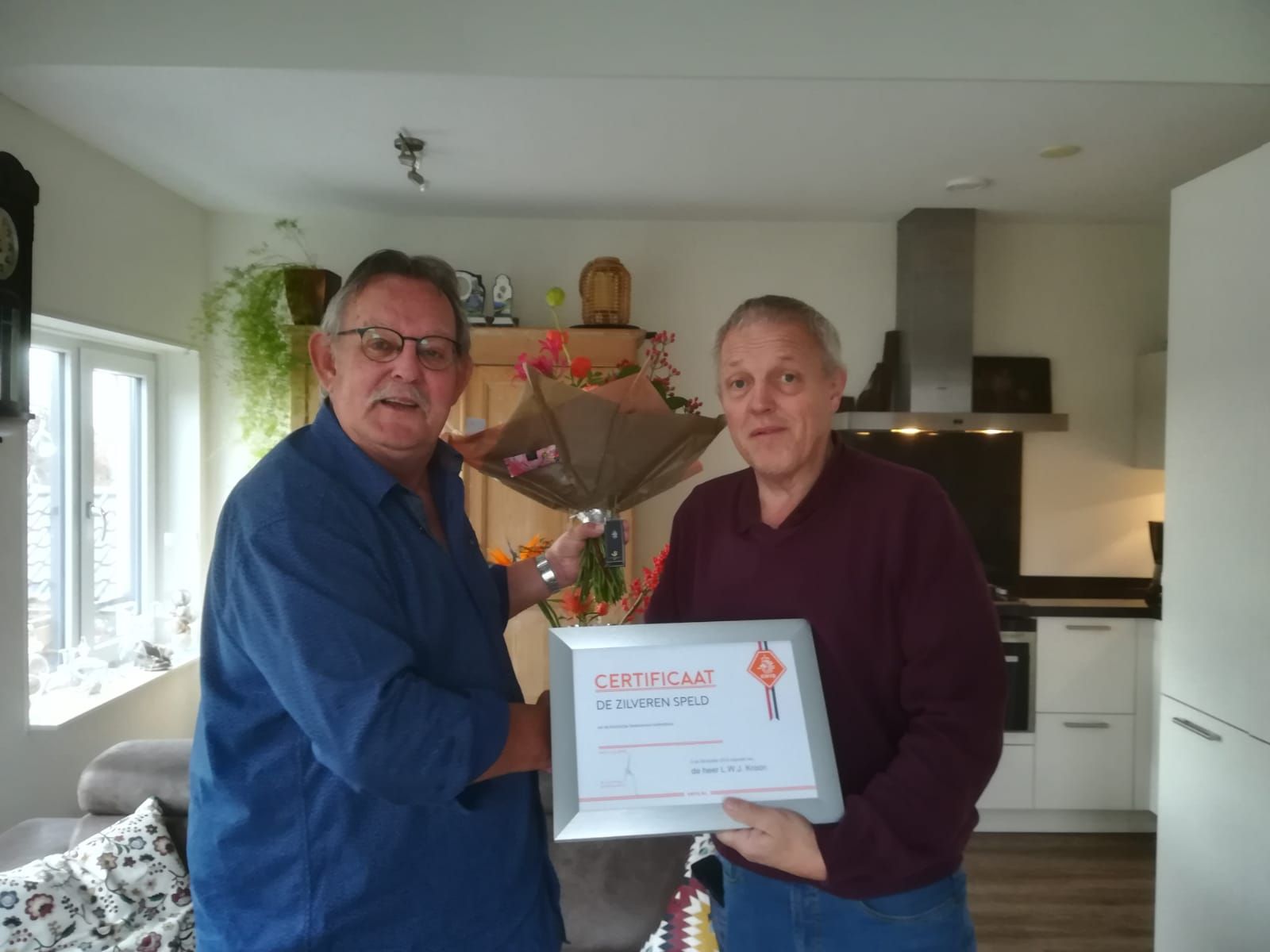Maar de zieke Bertus Kroon is weer beter. Het was voor ons dan ook tijd om hem te verrassen met zijn zeer verdiende zilveren speld en een mooie bos bloemen.