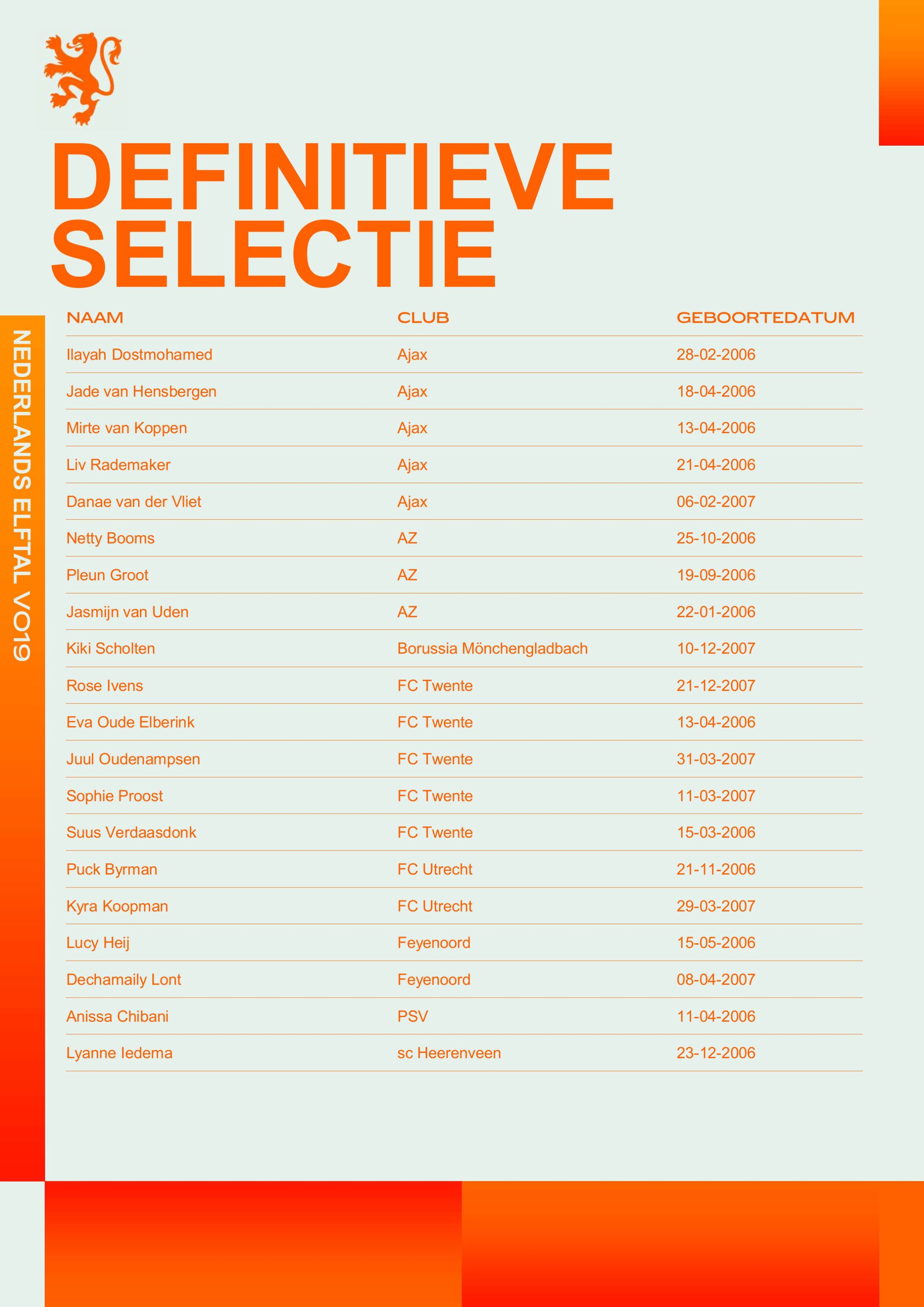 De met Witkampers-bloed opgroeiende Juul Oudenampsen is nu ook geselecteerd voor Nederland O19. Vanaf O15/O16/O17 is ze nu aangekomen bij de O19. Dat is nog weer een stapje moeilijker aangezien twee lichtingen samenvallen. Afgelopen seizoen speelde ze als verdediger (linker wingback, beetje type Dumfries) en maakte ze tien doelpunten waarmee ze in de top 5 stond. Dus het is niet zomaar dat ze geselecteerd is.