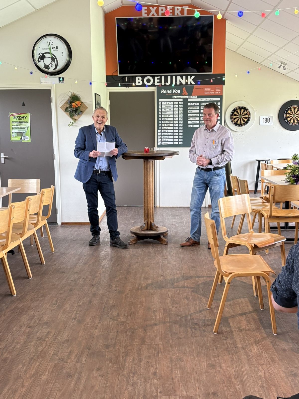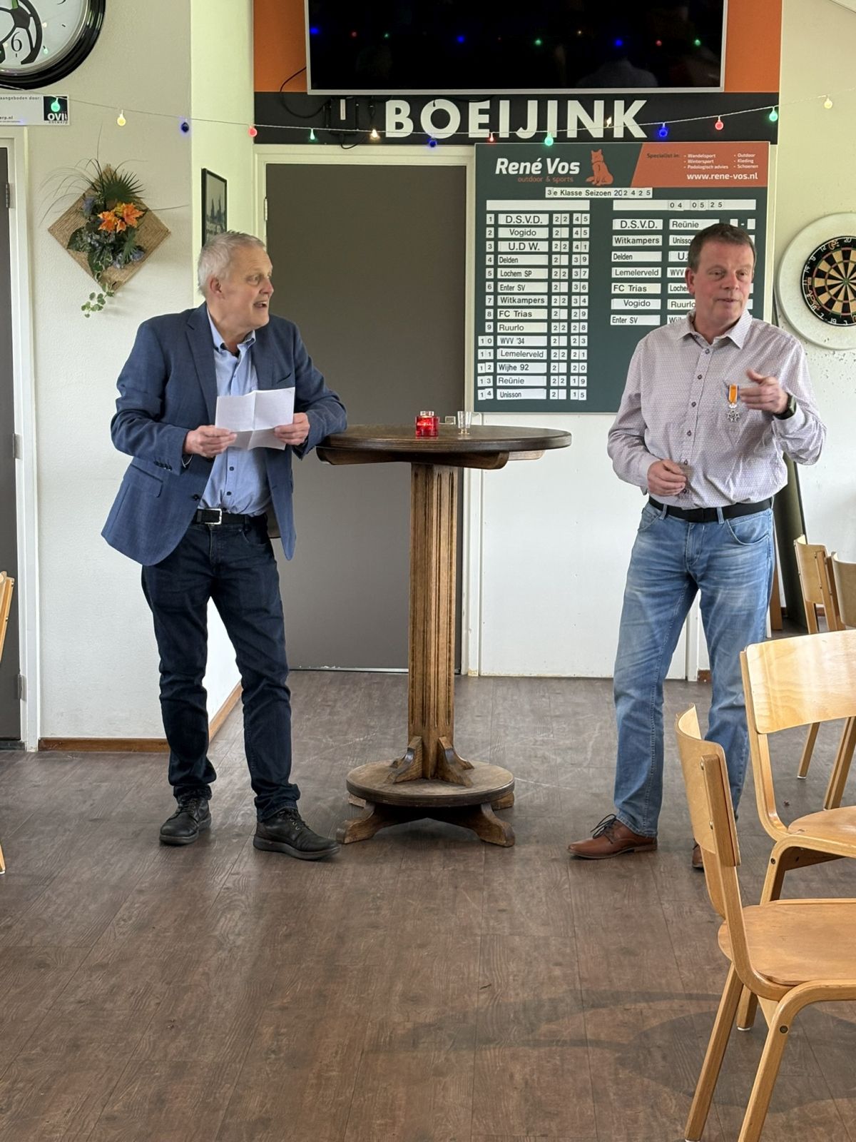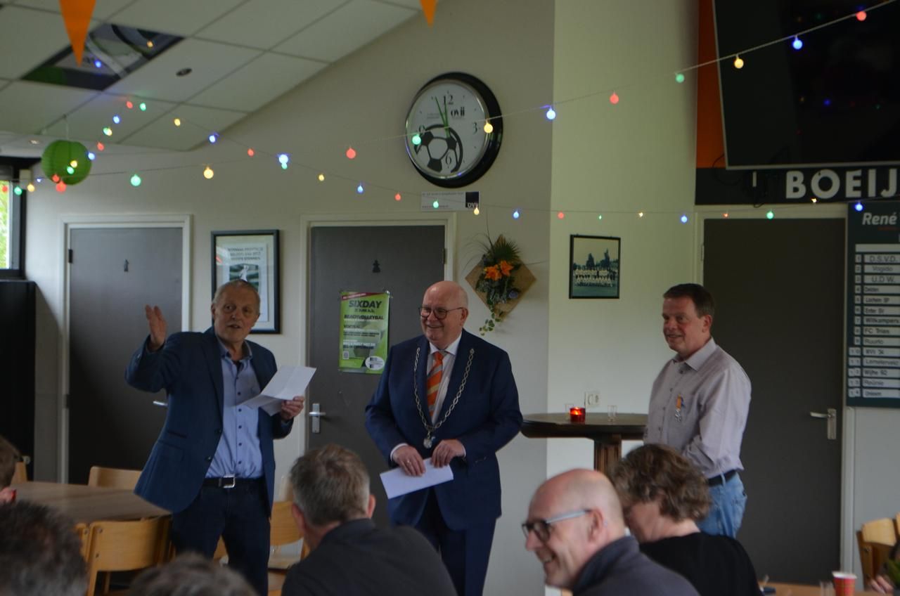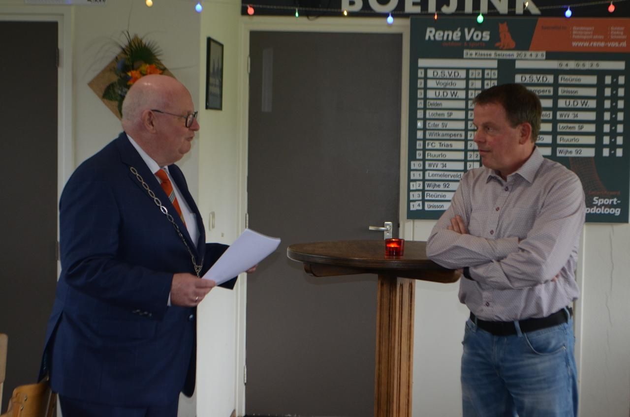 Dinand werd voor deze gelegenheid naar de kantine gelokt met een trucje. Vanuit zijn werkgever Naeff in Lochem werd hij voor een boodschap naar de Larense Welkoop gestuurd, waar hij werd opgevangen door onze voorzitter Johan Ikink. Johan vroeg Dinand even mee te komen naar de kantine, omdat hij een vraag had die alleen Dinand wist.