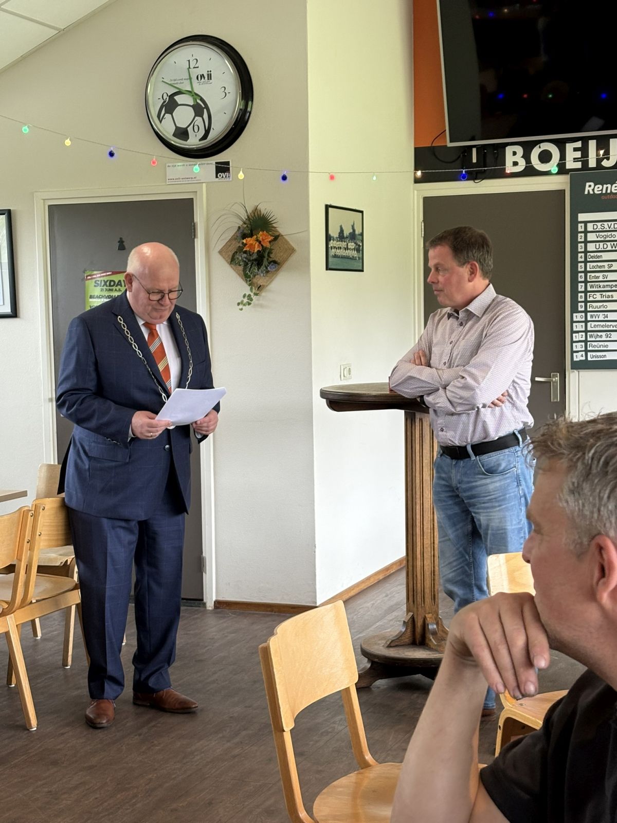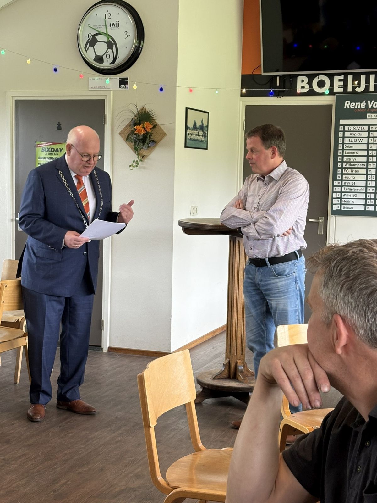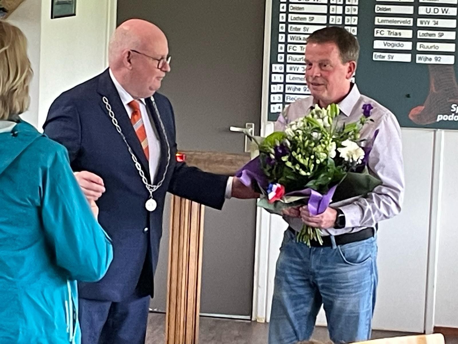 Dinand werd voor deze gelegenheid naar de kantine gelokt met een trucje. Vanuit zijn werkgever Naeff in Lochem werd hij voor een boodschap naar de Larense Welkoop gestuurd, waar hij werd opgevangen door onze voorzitter Johan Ikink. Johan vroeg Dinand even mee te komen naar de kantine, omdat hij een vraag had die alleen Dinand wist.