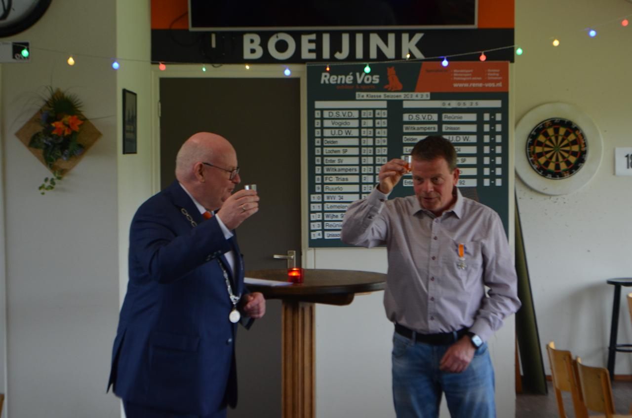 De Koninklijke Onderscheiding voor Dinand is aangevraagd door het bestuur van vv Witkampers voor zijn vele verdiensten voor de club. Het heeft verder geen zin alle werkzaamheden van Dinand voor de club op te noemen. Een ieder weet wat Dinand allemaal voor de club doet. De aanvraag werd ondersteund door EHBO Laren en de Scheidsrechtersvereniging Zutphen en Omstreken. Er werden toespraken gehouden door de respectievelijke voorzitters Johan Ikink, Astrid van de Weg en Marco Arnoldus. Ruud Wiggers hield namens werkgever Naeff ook nog een korte toespraak. Ook waren er nog leden van de biljartclub bij, want Dinand kan natuurlijk ook nog een beetje biljarten.