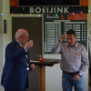 Deze truc lukte voortreffelijk. Dinand was tot dusver totaal niet op de hoogte. Hoe groot was zijn verbazing dat hij bij aankomst een grote groep belangstellenden aantrof. Toen viel bij hem het kwartje. Nadat hij natuurlijk zijn werkkleding verwisseld had voor wat gepaste kleding, werd hij ontvangen in de kantine. Burgemeester Backhuijs roemde Dinand voor al het vrijwilligerswerk wat hij in vele jaren gedaan heeft. Daarbij had de Burgemeester ook nog een paar leuke anekdotes, om vervolgens de versierselen aan een zichtbaar ontroerde Dinand uit te reiken. Onder luid applaus vertrok de Burgemeester met zijn gevolg voor een volgende uitreiking, ook in Laren.