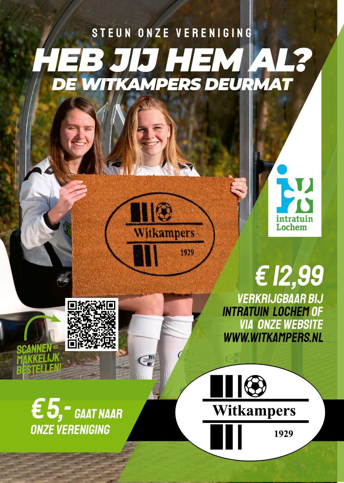 Voetbal jij bij de Witkampers in Laren of ben je de grootste fan van deze club? Dan mag deze mooie deurmat zeker niet ontbreken bij je voordeur! Begin december krijgt Intratuin een leuk nieuw artikel binnen: namelijk een echte Witkampers Laren deurmat. De deurmat heeft een afmeting van 75 x 45 cm en kost slechts 12,99. Voor elke verkochte mat sponsort Intratuin 5,- euro aan de vereniging, die dit zeker in deze tijd goed kan gebruiken. Win-win!