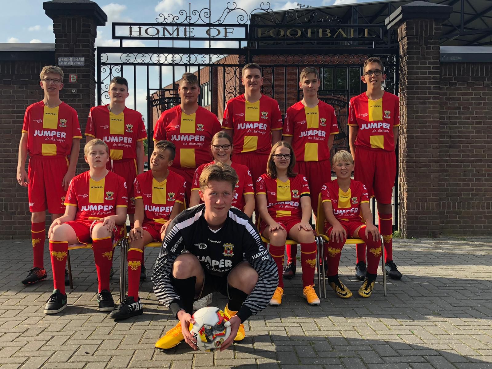 Foto 3: Een teamfoto voor de poort van het stadion