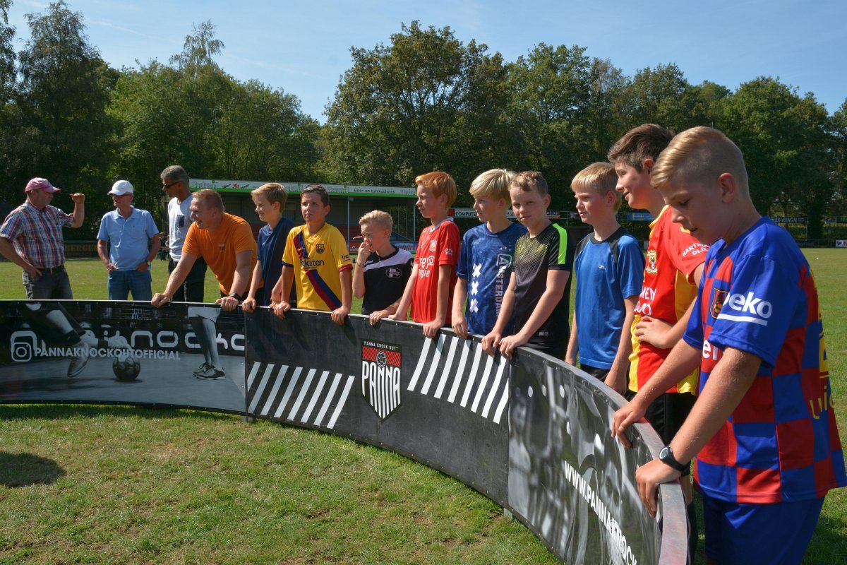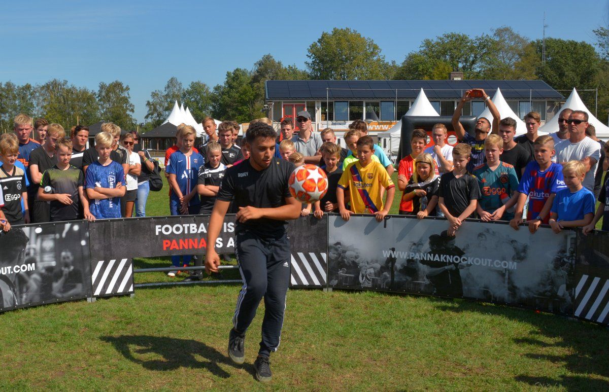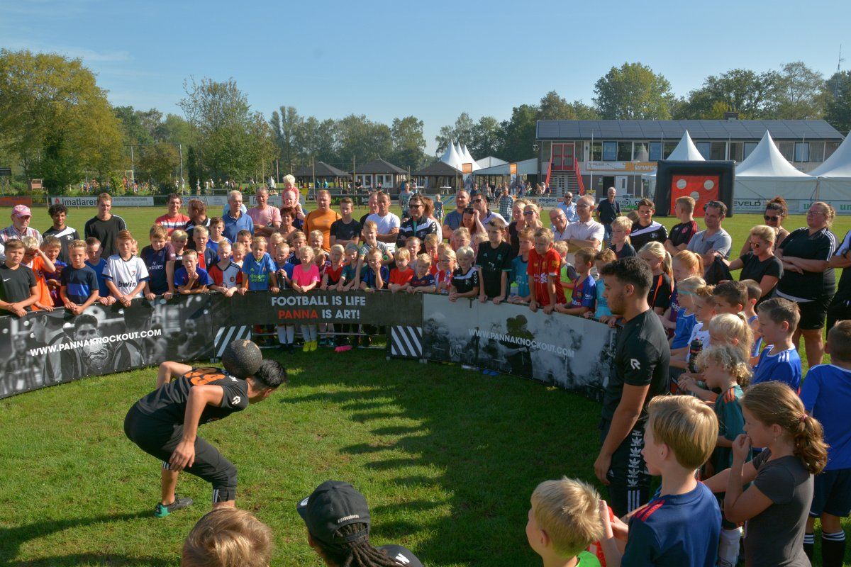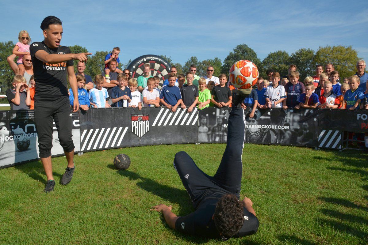 Met het grootste gemak gaat de bal in de nek en laten ze trucjes zien met de bal om van te watertanden. Uiteindelijk draaide het om de Panna! Een aantal stoere spelers durfden het aan om met de balvirtuozen de strijd aan te gaan. Helaas moesten ze toch het onderspit delven, net als de voorzitter van de Jubileumcommissie Appie Bielderman die er ook aan moest geloven.