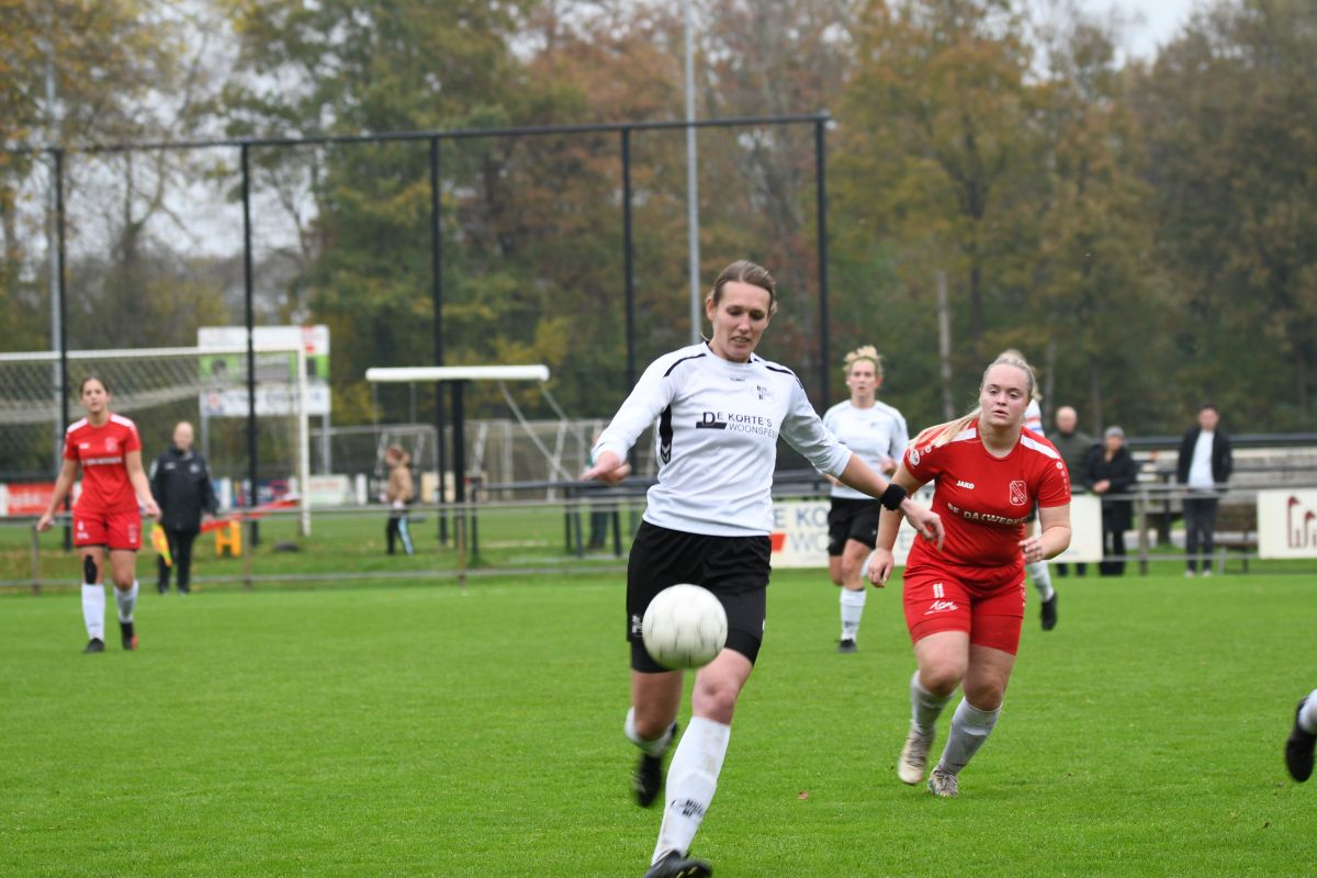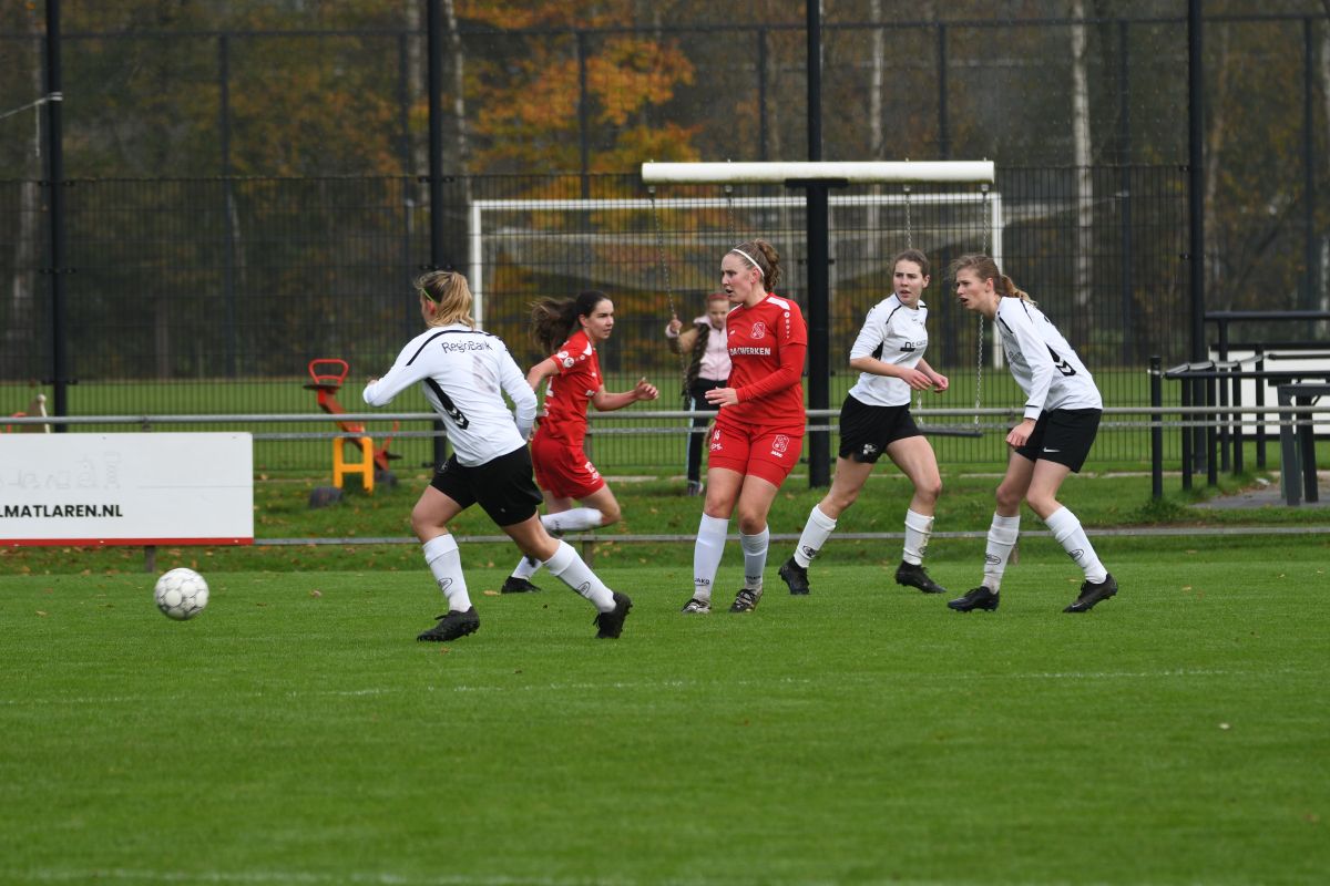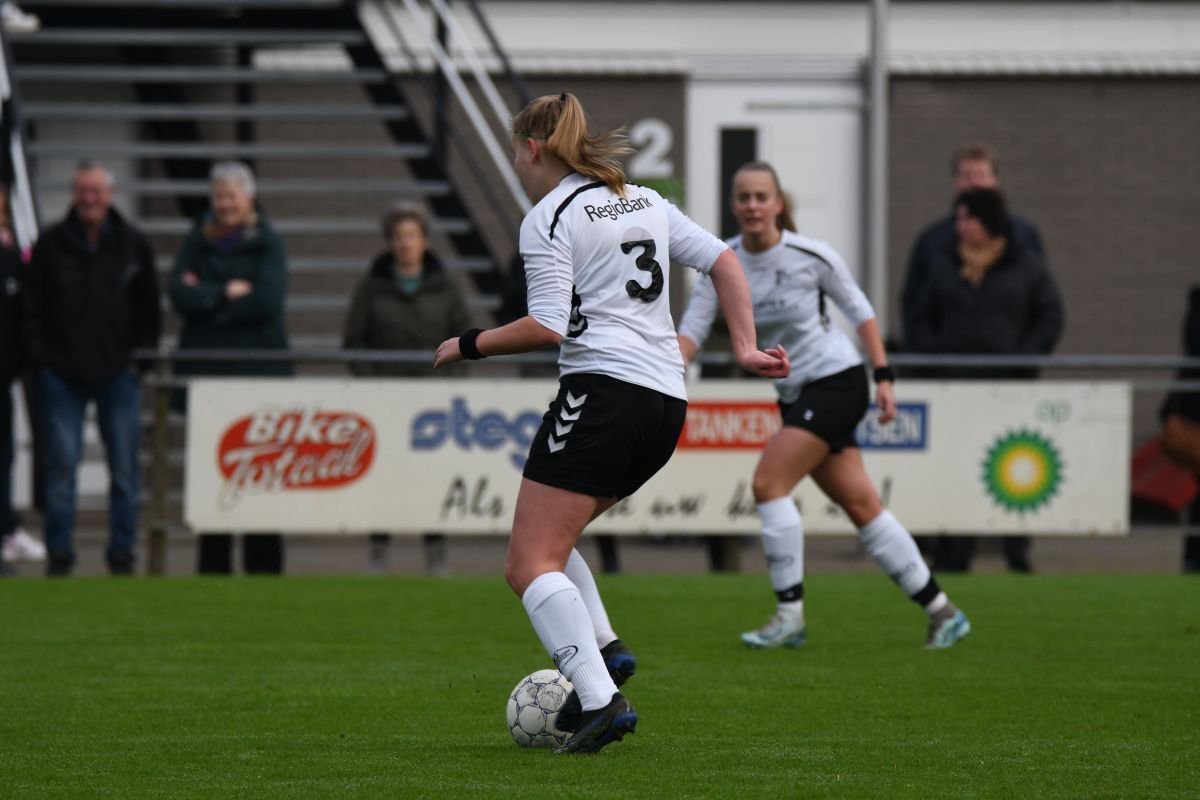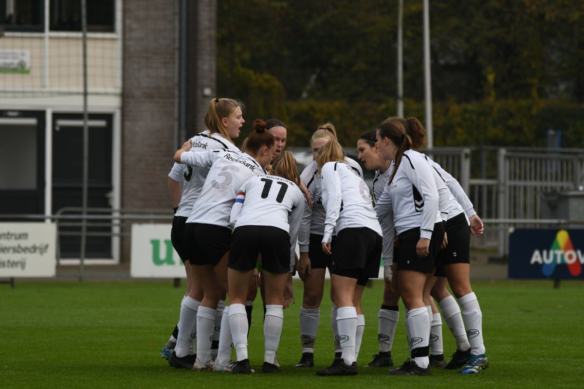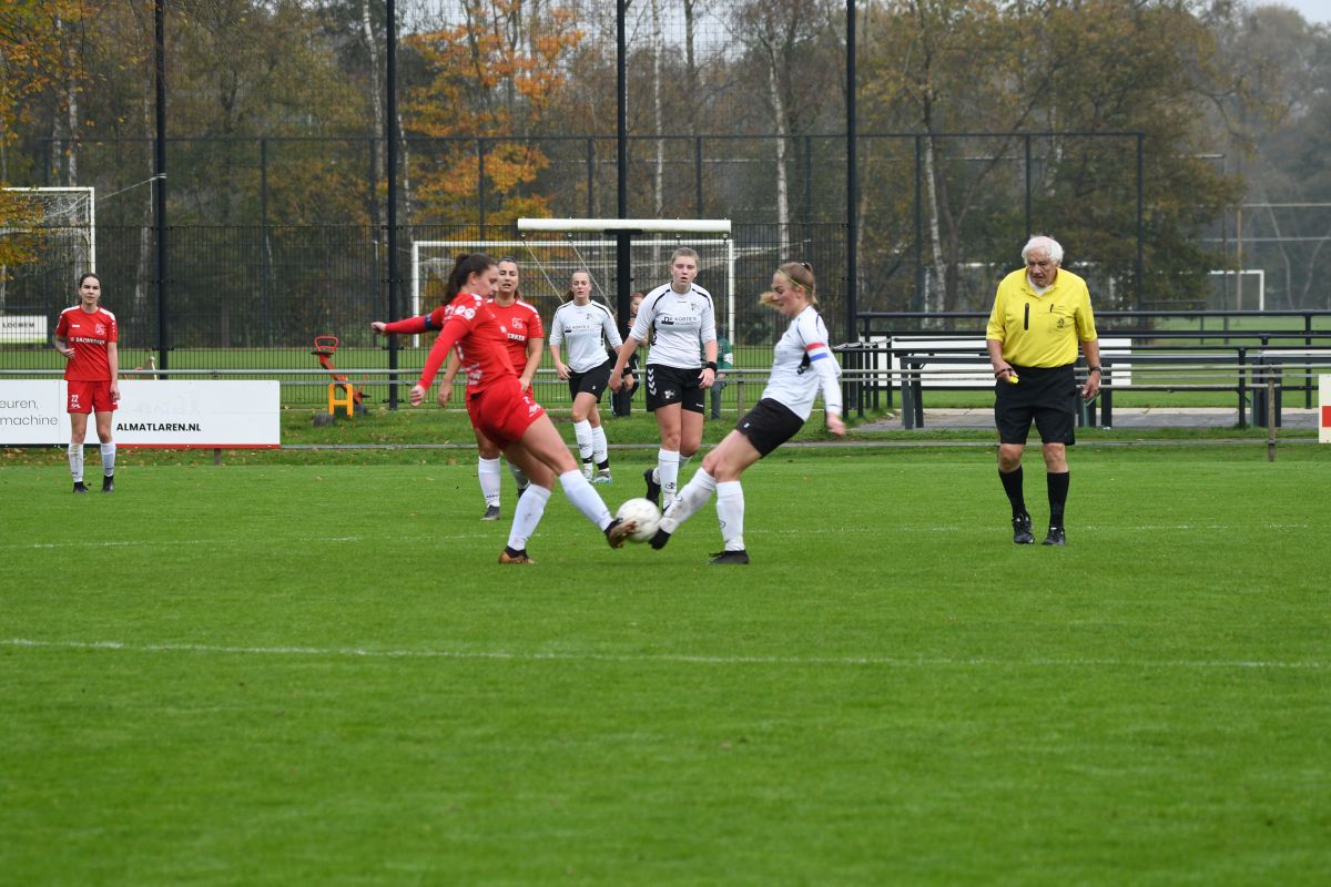 Een puntje in Laren houden zou, na het zien van de 1e helft, een prima resultaat zijn. De 2e helft beginnen we wat optimistischer. Na 10 minuten hebben Daphne en Vene op goal geschoten en krijgt Denice via een corner de kans om de bal in te koppen. Op alle 3 de inzetten heeft de keeper een antwoord. We dringen Alverna wat verder terug dan in de 1e helft. In de 65e minuut krijgen wij een vrije trap. Deze belandt bij Bodine, die haalt uit. Helaas vliegt de bal naast het goal. 10 minuten later krijgt Alverna een vrije trap. Ook deze bal belandt niet in het netje. Tess weet de bal knap uit het goal te houden. De enige echte kans die wij krijgen is uit een vrije trap in 83e minuut. Vene schiet een vrije trap vanaf een meter of 20 op de lat. Helaas staat er niemand bij de 2e paal om de bal in het goal te werken. Alverna weet 2 minuten later met een lange bal nog wat gevaar te stichten, maar ook hier ontstaat geen echte kans. Al met al is 0-0 een terechte uitslag. We hebben geen weg weten te vinden door de sterke verdediging van Alverna. We hebben een punt in Laren weten te houden en dat is achteraf ook alles wat er in zat.
