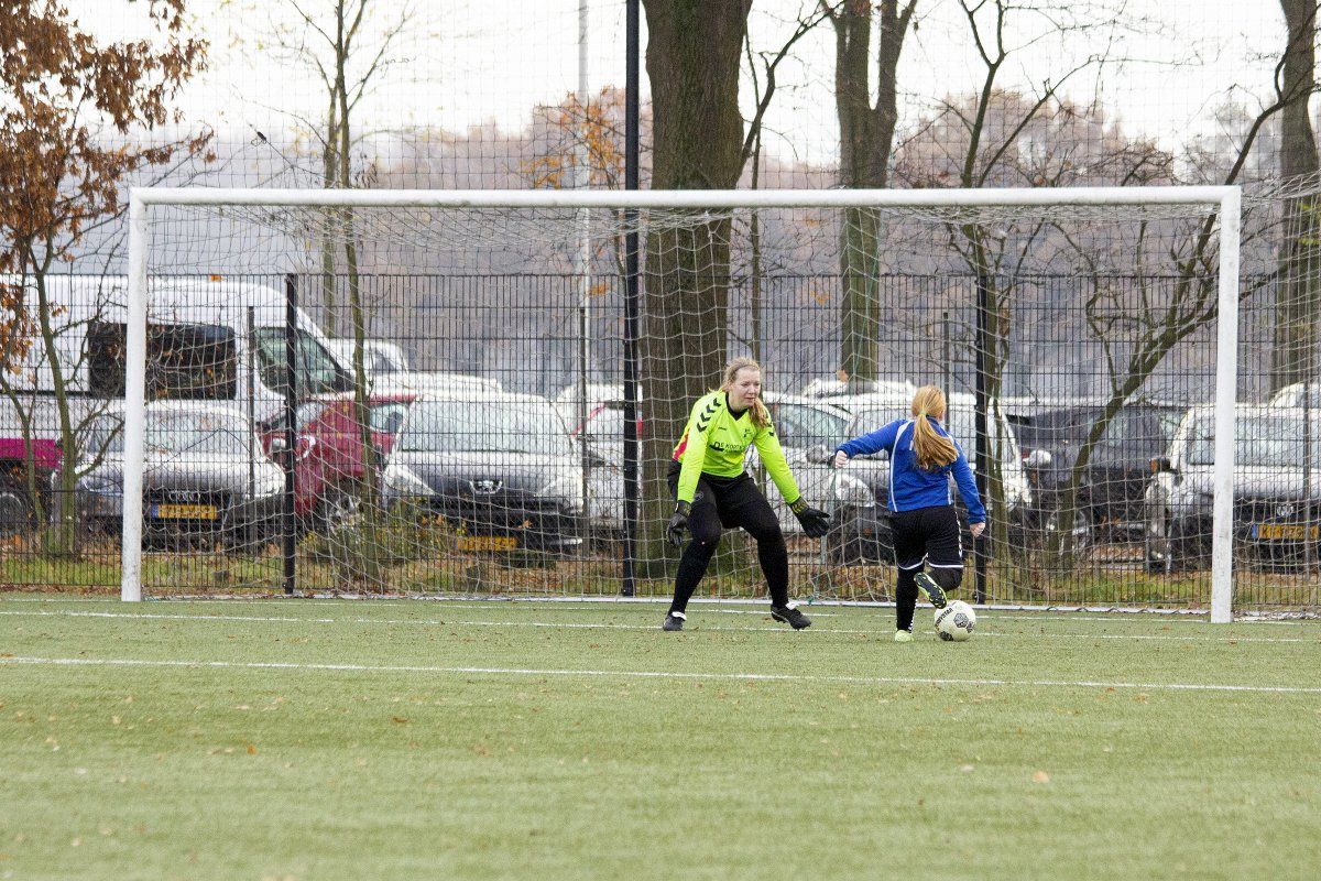 Iets over half 1 werd er afgetrapt. Het kunstgrasveld van Someren was klein en snel. We moesten het balletje dus goed rond laten gaan door snel te handelen. In de eerste paar minuten lukte dit aardig goed en creëerden we zelfs een paar kleine kansjes. Helaas mist Daphne de verre hoek op een paar centimeter. Net als vorige week weten we de kansen niet om te zetten in doelpunten en daar gaat onze tegenstander effectief mee om, binnen acht minuten kijken we namelijk al tegen een 3-0 achterstand aan. Vanaf dat moment lijkt er een knopje om te gaan; Marieke weet de bal rond het zestienmeter gebied goed af te schermen, Carmen komt inlopen waarop Marieke de bal breed kan leggen, helaas belandt de bal in de handen van de keepster. Toch weten we in de laatste vijf minuten voor de rust tot twee keer toe te scoren. Elisa geeft een voorzet vanaf rechts op Tessa, die hem beheerst binnen kan schieten. Vervolgens verricht Mignot goed verdedigend werk waarop ze Tessa voor de goal kan bereiken; 2-3.