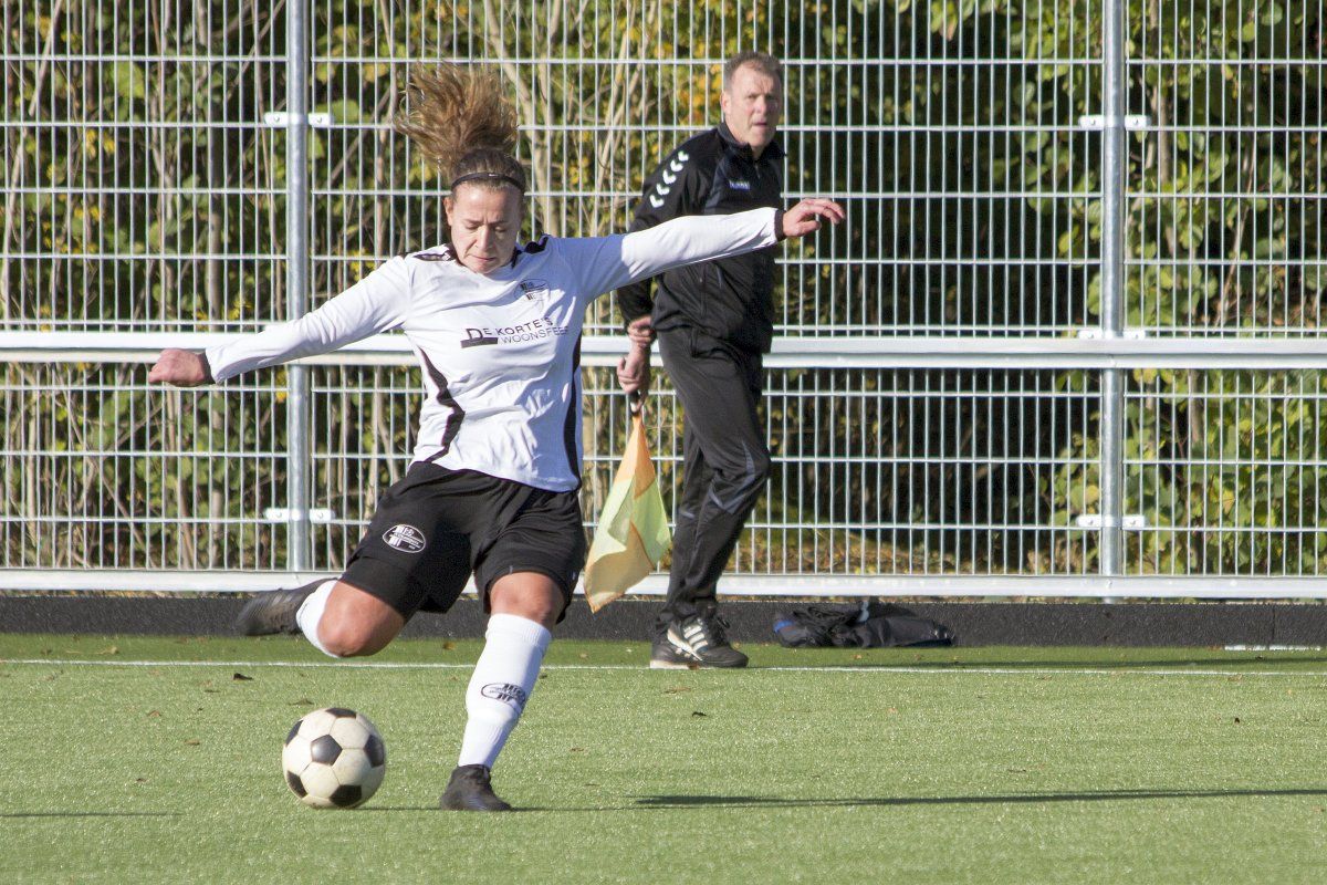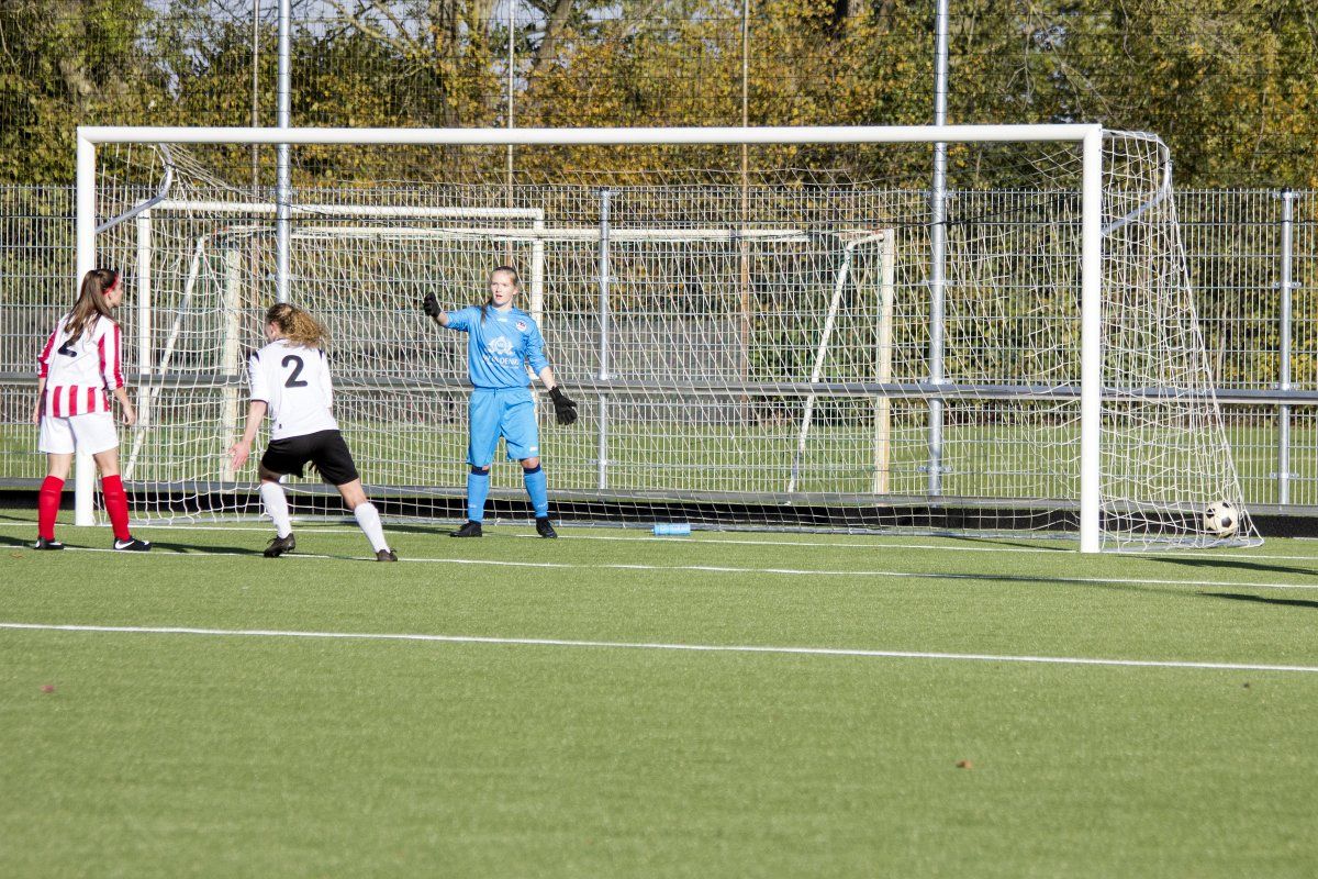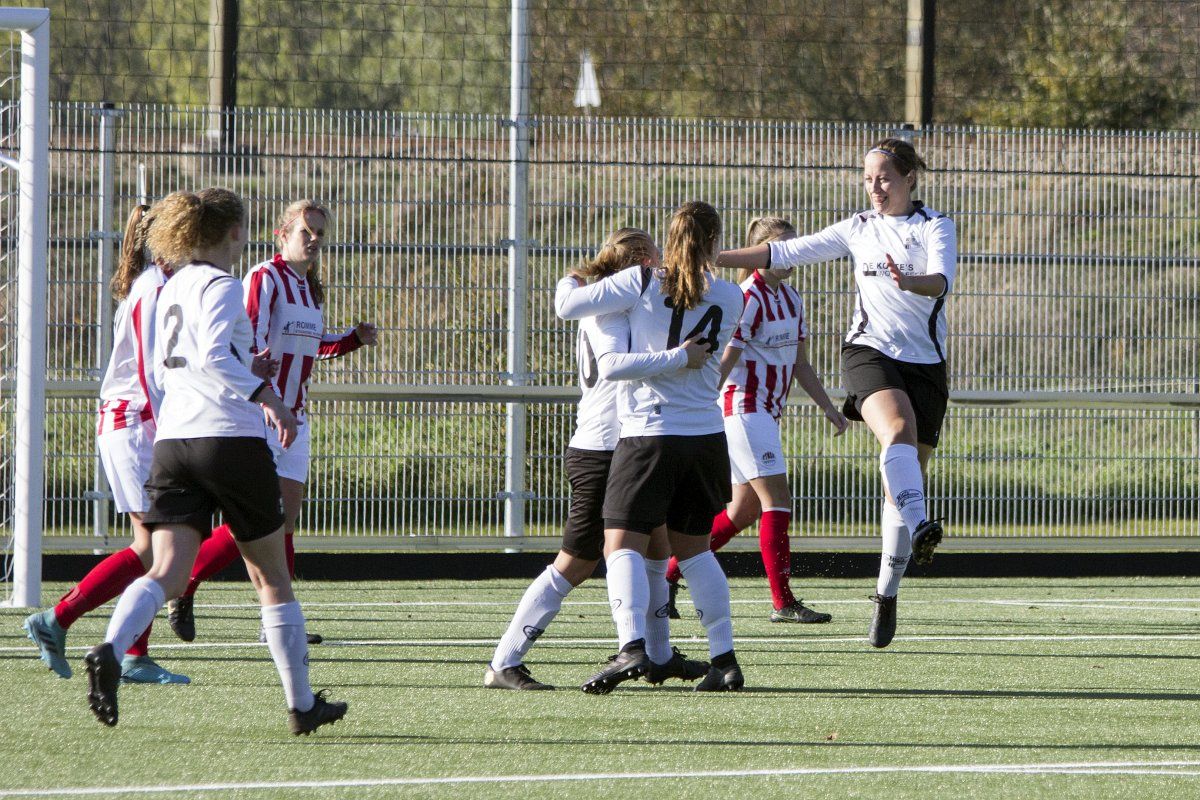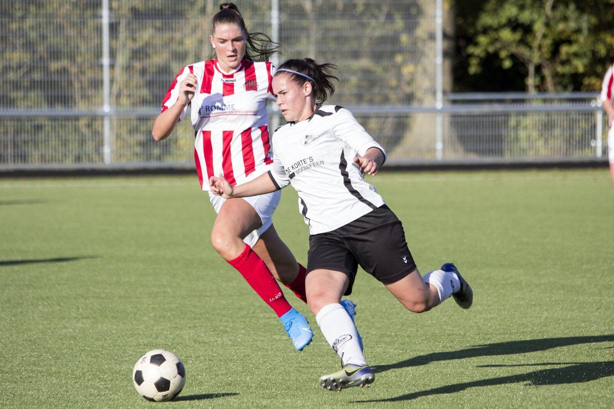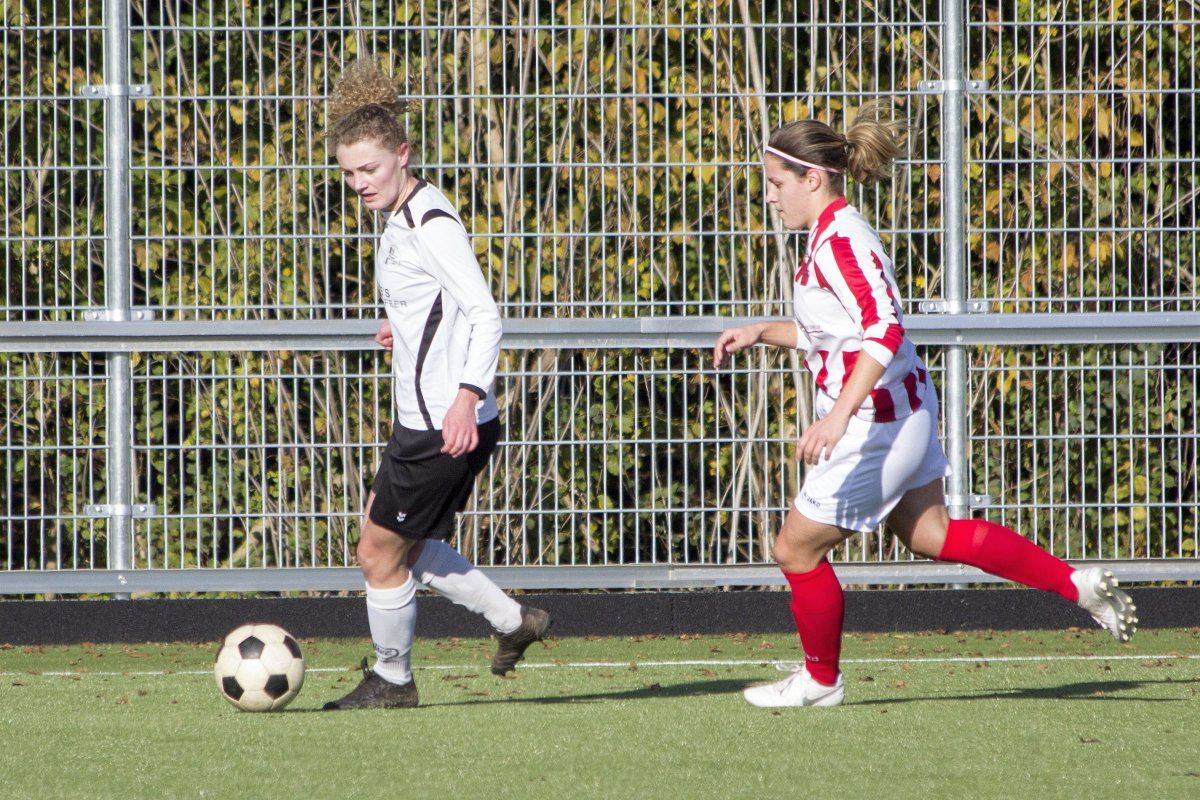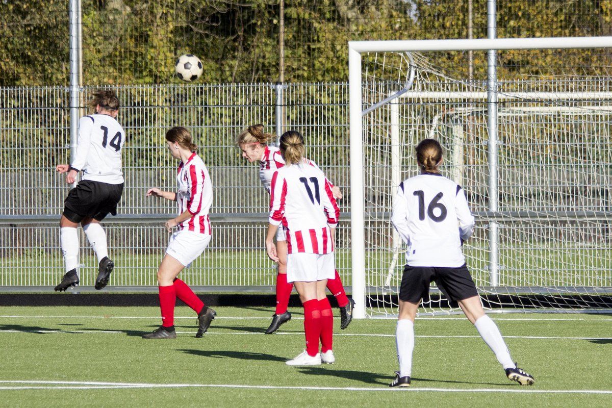 Vandaag stond de uitwedstrijd tegen de vrouwen uit Geffen op het programma. Om stipt 12:00 uur wordt er afgetrapt. In de eerste paar minuten weet Witkampers goed spel te laten zien en dit resulteerde ook in een paar kleine kansjes, maar die werden helaas niet benut. Na de eerste vijf minuten draaide het spelbeeld totaal om, VR1 werd overrompeld door Nooit Gedacht en al snel stonden wij tegen een 2-0 achterstand aan te kijken. Door persoonlijke foutjes en de ontbrekende felheid konden wij niet veel inbrengen, eerste én tweede ballen werden verloren, maar gelukkig wisten zij het netje niet te vinden doordat Anne goed haar doel wist te verdedigen. Wel had VR1 nog een penalty verdiend doordat Daphne werd neergehaald in de 16-meter, maar deze werd niet gegeven. Vlak voor rust weet VR1 nog de aansluitingstreffer te maken. Polly legde de bal goed breed op Tessa. Met een goede voorzet wist zij Daphne te bereiken en zij kopte de bal diagonaal in de goal: 2-1.