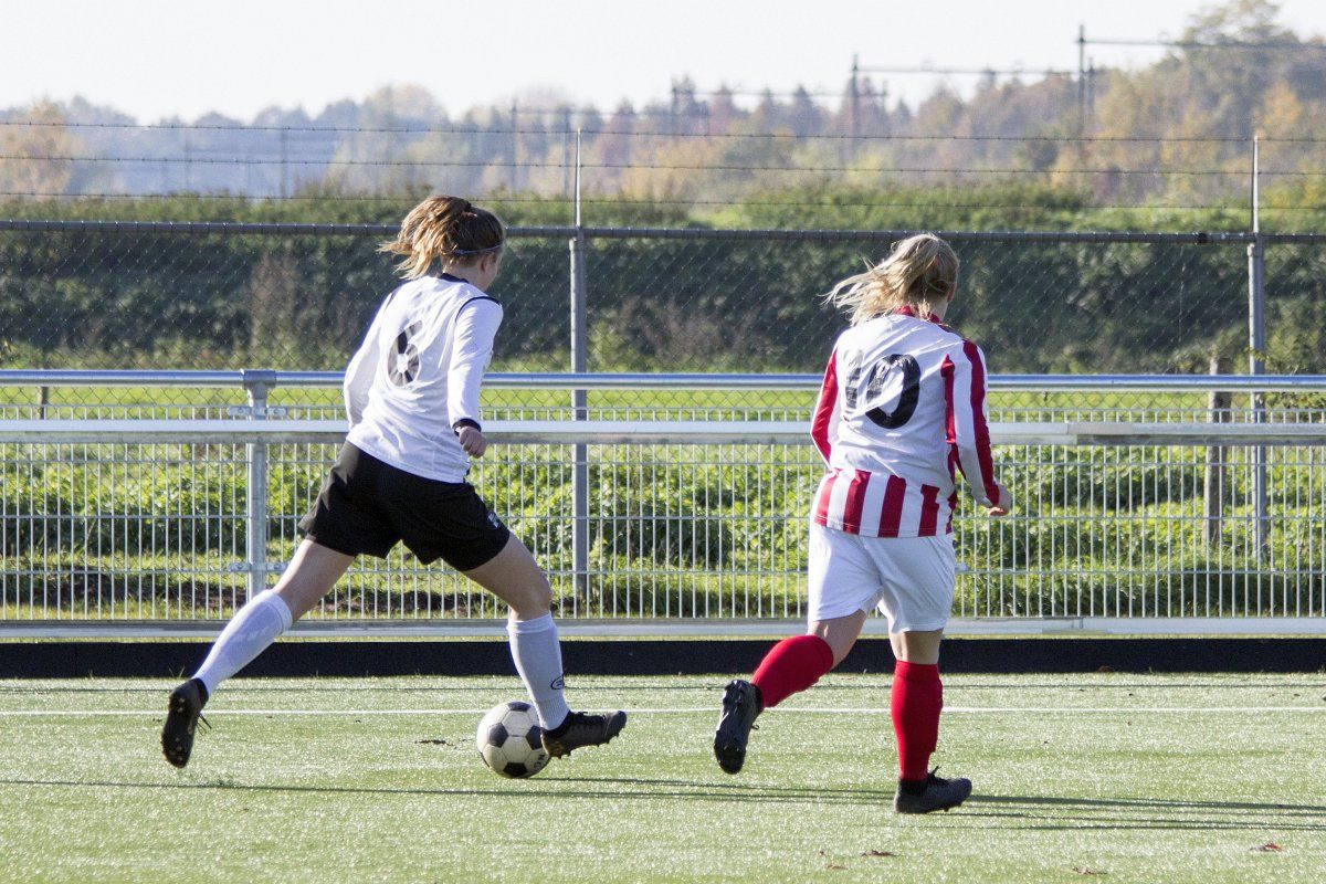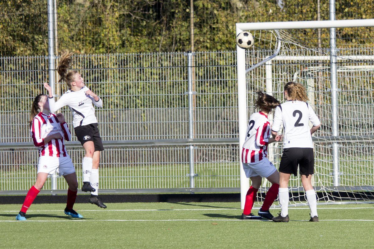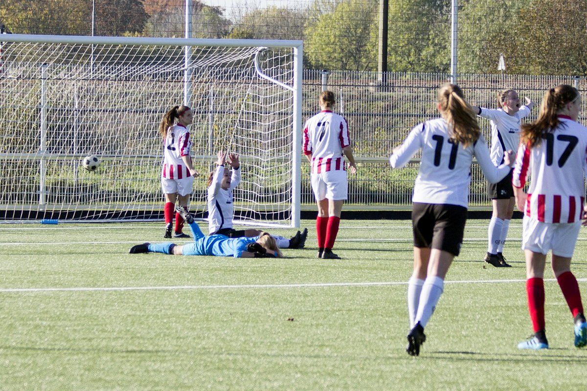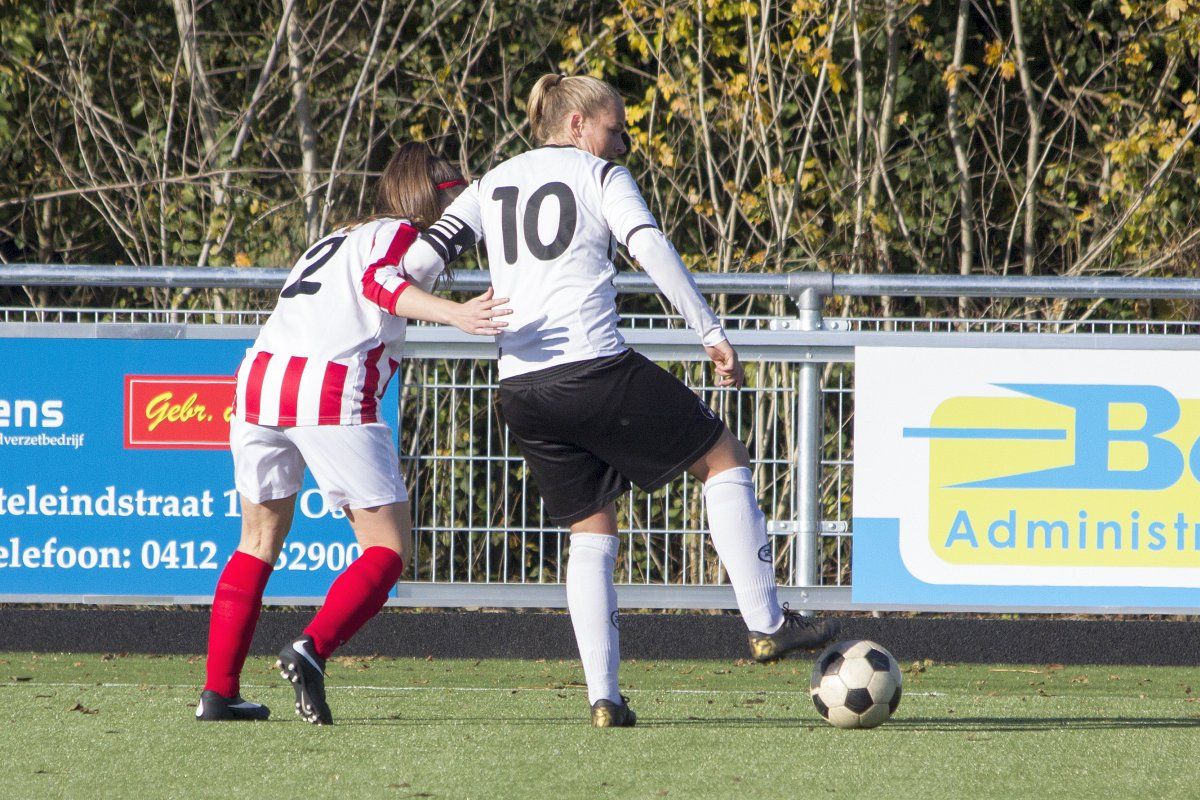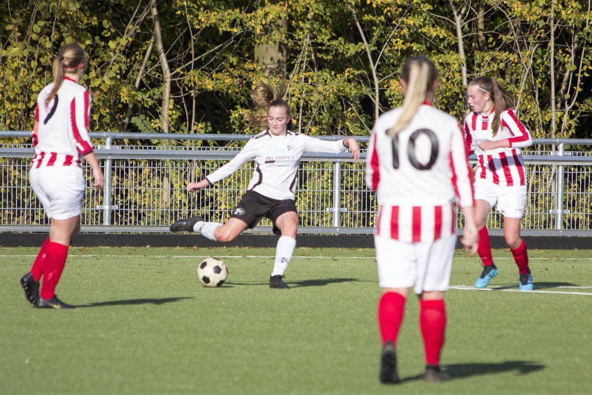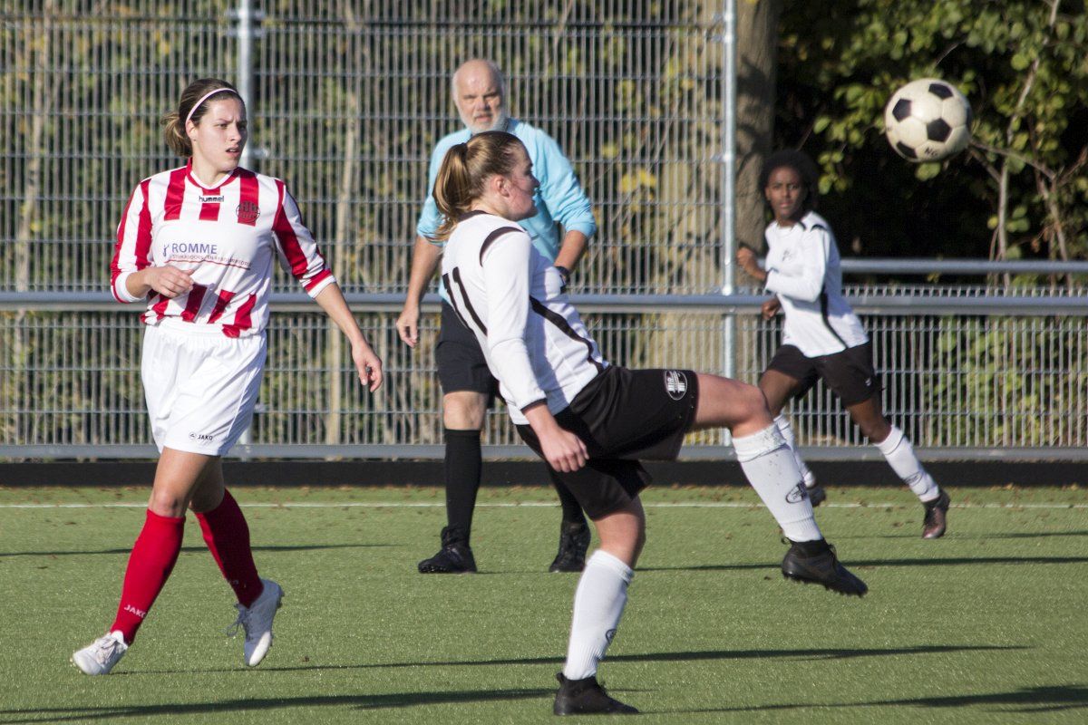 Vandaag stond de uitwedstrijd tegen de vrouwen uit Geffen op het programma. Om stipt 12:00 uur wordt er afgetrapt. In de eerste paar minuten weet Witkampers goed spel te laten zien en dit resulteerde ook in een paar kleine kansjes, maar die werden helaas niet benut. Na de eerste vijf minuten draaide het spelbeeld totaal om, VR1 werd overrompeld door Nooit Gedacht en al snel stonden wij tegen een 2-0 achterstand aan te kijken. Door persoonlijke foutjes en de ontbrekende felheid konden wij niet veel inbrengen, eerste én tweede ballen werden verloren, maar gelukkig wisten zij het netje niet te vinden doordat Anne goed haar doel wist te verdedigen. Wel had VR1 nog een penalty verdiend doordat Daphne werd neergehaald in de 16-meter, maar deze werd niet gegeven. Vlak voor rust weet VR1 nog de aansluitingstreffer te maken. Polly legde de bal goed breed op Tessa. Met een goede voorzet wist zij Daphne te bereiken en zij kopte de bal diagonaal in de goal: 2-1.