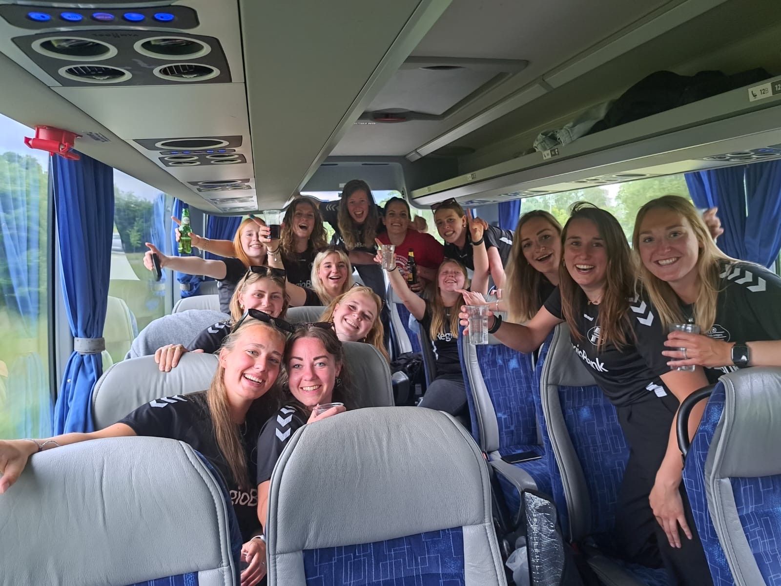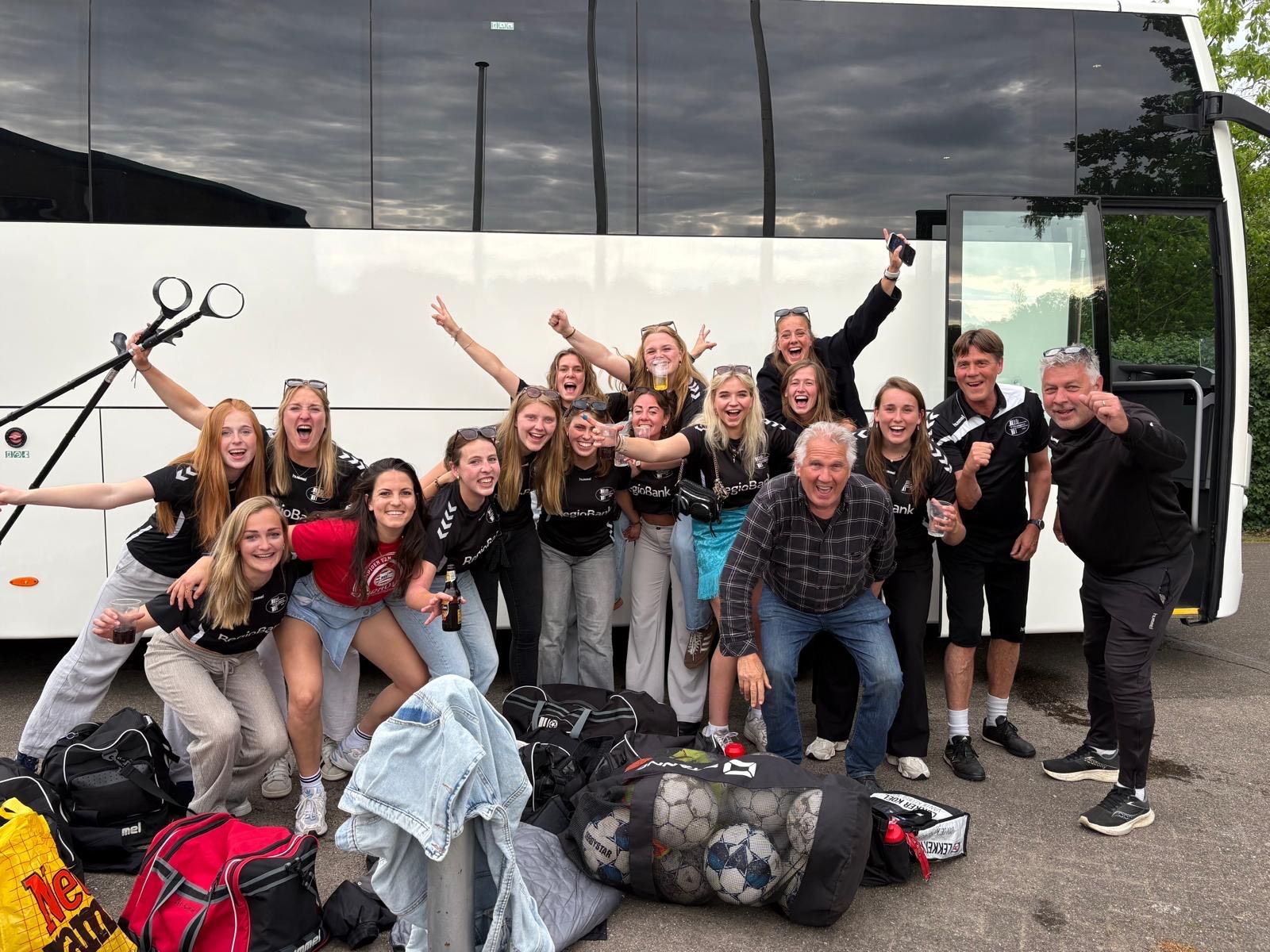 We spelen onze laatste competitie wedstrijd in het verre Bergen. De dag begint al vroeg. Netjes is, bijna, iedereen op tijd aanwezig om de verre reis te maken. Klein probleempje, het vervoer is nog niet aanwezig. Er wordt gauw rond gebeld of er iemand in Laren en omstreken nog iets van een bus heeft staan. Iedereen is gebracht of met de fiets, dus zelf rijden is geen optie. Tot ons grote geluk komt daar ineens een grote bus om de hoek rijden. Er ontstaat lichte verwarring, aangezien wij een kleine bus hebben besteld. Zou de bus dan niet voor ons zijn. Als we goed kijken, zien we onze favoriete buschauffeur aan het stuur zitten. Het is Hans! Vrolijk zwaaiend komt hij aanrijden. Foutje in de communicatie heeft er voor gezorgd dat Hans iets te laat is. Geen paniek dus, we hebben vervoer.
