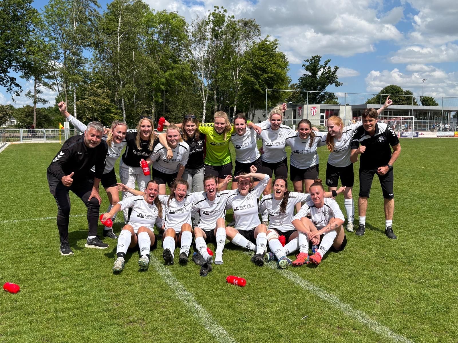Er valt hier best iets te halen. Wel gaat Bergen weer in een redelijk “normale” opstelling spelen. Dus je zou verwachten dat we het een stuk zwaarder gaan krijgen. 10 Minuten na rust krijgt Bergen een vrije trap. Vene probeert de bal weg te stompen, maar een inschattingsfout zorgt ervoor dat de aanvaller bij de 2e paal helemaal vogelvrij kan inkoppen. De voorsprong die we hadden is helemaal weggepoetst. Er is nog tijd genoeg om de gelijkmaker te maken. Aat brengt Jane en Benthe in en wisselt van keeper. Denice gaat op goal en Vene gaat het veld in. Ook Carmilla verhuisd van achter naar voor. Er komt veel druk op de verdediging van Bergen. Er ontstaan kansen voor ons, maar in de afwerking ontbreekt het aan scherpte. De druk wordt Bergen uiteindelijk te groot. Benthe geeft een voorzet en de verdediger van Bergen tikt de bal netjes achter haar eigen keeper. 2-2! Als het zelf niet lukt om te scoren, dan is het erg fijn als de tegenstander een handje helpt. De 2-3 zit er niet meer in, de wedstrijd eindigt in een gelijkspel. Iets wat voor ons voelt als een overwinning. In de bus terug wordt dit dan ook uitgebreid gevierd.