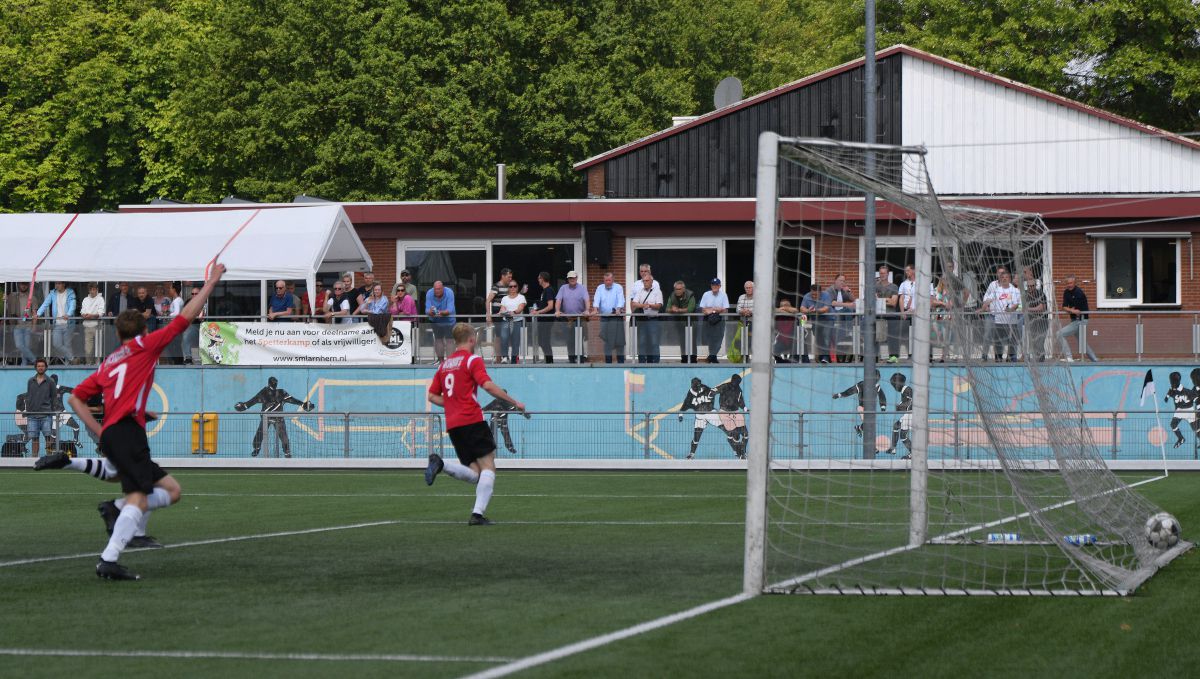 Witkampers begint overtuigend aan de wedstrijd, heeft wat meer de bal en zonder tot echt grote kansen te komen hangt een Larense goal al wel een beetje in de lucht. Een inzet net buiten de zestienmeter wordt door Raoul Haijtink net naast geschoten. SML is echt een beetje aan het zoeken hoe grip te krijgen op Witkampers. De gastheren beschikken wel over een goede ploeg met een paar bijzonder vaardige voetballers. De eerste kans die SML vervolgens krijgt is gelijk raak. Een vrije trap in de buurt van de cornervlag wordt hoog voorgegeven en wordt in behoorlijke vrijheid binnengekopt. Een tegenvaller. Na deze goal lijkt Witkampers het een beetje kwijt. SML wordt dominanter en is gedurende een groot gedeelte van de eerste helft de bovenliggende partij. Net voor rust doet Witkampers iets terug. Het is een goal die bijna een gespiegelde versie van het eerste doelpunt van SML is. Een vrije trap in de buurt van de cornervlag en ditmaal is het Colin Stegeman die goed binnenkopt. Een mooie opsteker voor Witkampers en een duidelijke tegenvaller voor de thuisploeg.