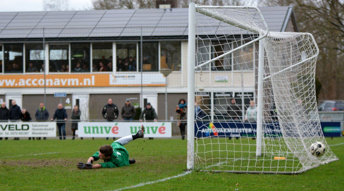 Vervolgens is het tijd voor een situatie waarin de wind wél een grote rol speelt. Jordy Woestenenk mag een hoekschop nemen en zijn inzet zeilt met een flinke vaart achter de verbouwereerde doelman in 1 keer in het doel. Een treffer zoals je maar zelden ziet, maar vandaag is zo’n dag.