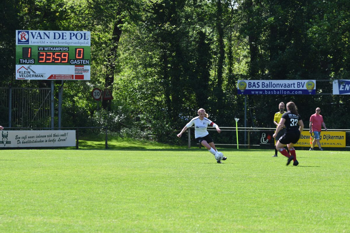 Om 12 uur wordt er afgetrapt in Laren. De eerste 10 minuten is de wedstrijd in evenwicht, grote kansen blijven uit. In de 18e minuut is er dan de eerste grote kans voor de uitploeg, voorzet vanaf de zijkant gaat over Isa heen. Gelukkig kan de tegenstander de bal niet in het goal krijgen. We komen goed weg. Een paar minuten later komt Beuningse Boys weer met een kans, Isa redt knap. Er volgt een corner, deze corner wordt naast gekopt. Op de helft van de eerste helft is er een drinkpauze ingelast. Het is dorstig weer. De meiden krijgen een peptalk. Dit werkt want gelijk daarna is de kans voor Witkampers. Deze kans wordt half weggewerkt door de tegenstander en Witkampers kan een nieuwe aanval opzetten via Kaylee. Kaylee levert een goede bal op Daphne. Zij maakt een actie en kan afronden op de goal. GOAL. Witkampers - Beuningse Boys 1-0 na 25 minuten spelen. 10 minuten later krijgt Witkampers een corner, deze wordt gegeven door Els. De bal komt mooi hoog voor. Romy kan hem niet hard genoeg raken. De bal blijft in de kluts hangen en Beuningse Boys kan hem niet goed wegwerken. Een nieuwe aanval wordt opgezet met een voorzet van Vene, Lotte kan koppen, maar helaas over de goal. 5 minuten voor rust komen we met een grote kans, Dapnhe kan de bal meenemen vanaf het middenveld. Ze legt breed op Romy, Romy kan hem niet langs de keeper krijgen. Er volgt een treurige blessure van Sarieke. Wissel: Yinke erin voor Sarieke. Aan het einde van de eerste helft krijgt Beuningse Boys nog een corner, de bal blijft in de kluts hangen bij onze goal en deze wordt binnengewerkt door de tegenstander. We gaan rusten met 1-1 stand op het scorebord.