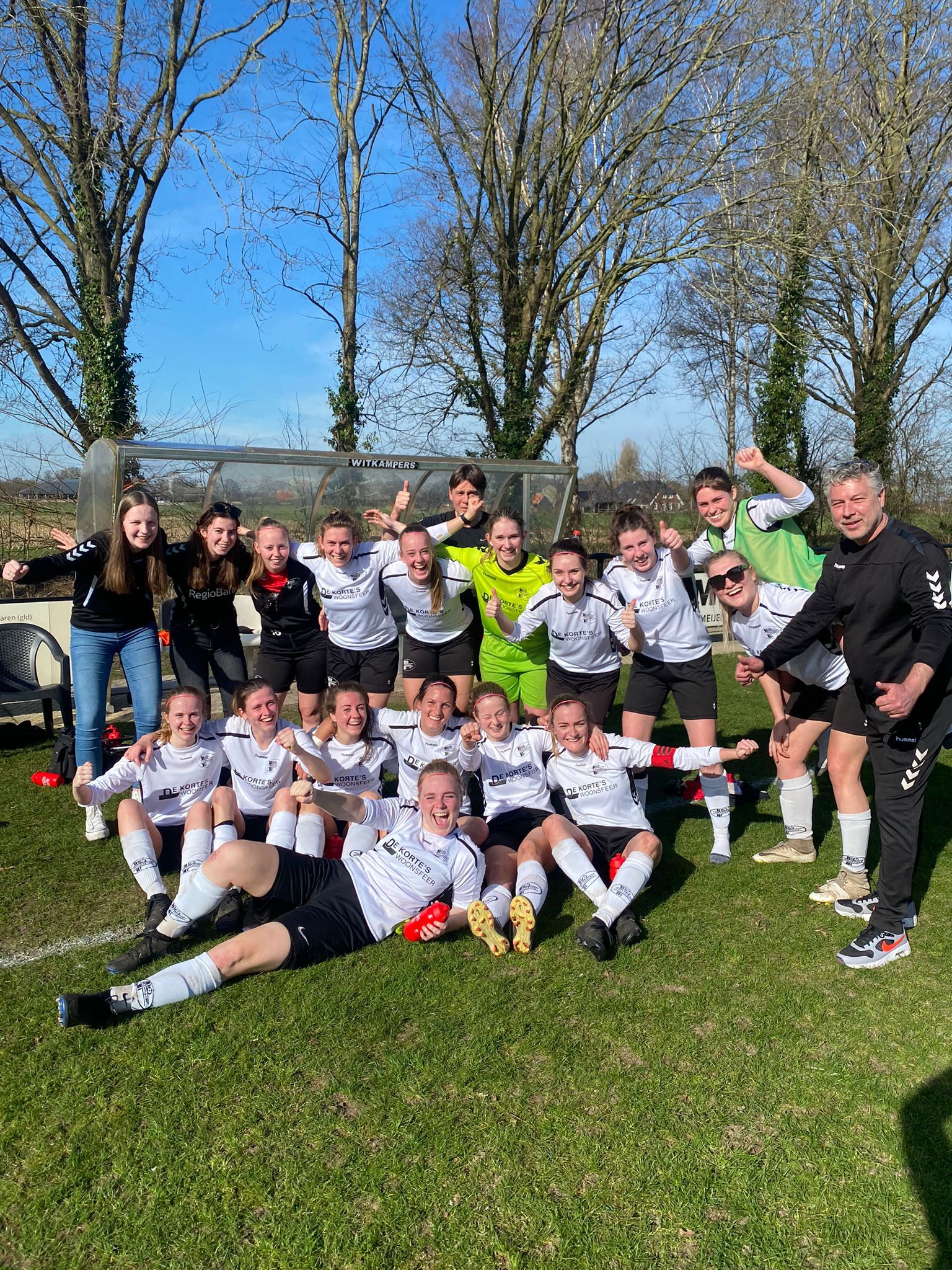 De rust werd gebruikt om even af te koelen. Het stralende zonnetje was heerlijk voor het talrijke publiek, maar voor de speelsters best pittig na alle regen de afgelopen tijd. Maar ook werden de puntjes op de i gezet. Blijf druk uitoefenen op de tegenpartij, zodat ze fouten gaan maken en neem zelf iets meer tijd voor de juiste eindpass. De kansen komen echt wel. Ook de 2e helft vliegen we uit de startblokken. Al snel glipt Daphne langs haar tegenstander en zet ondanks vasthouden goed door en kan de bal nog net dat zetje geven, waardoor de insprintende Lotte de bal achter de keepster kan werken. De verdiende 1-0 stond eindelijk op het scorebord. We blijven dominant en kansen creëren. Vene wordt neergehaald en de vrije trap net buiten de 16 scheerde helaas net over het doel. Uit een spaarzame tegenaanval van Winkel ontstond een corner en tot ontsteltenis van speelsters en publiek werd de bal er nog ingeschoten ook. De onverdiende 1-1 stond op het scorebord. Maar Witkampers zou Witkampers niet zijn als de mouwen niet nog eens verder werden opgestroopt. De duimschroeven werden nog eens extra aangedraaid en de reserves werden aangesproken. Rechtsback Aukje stoomt op en weet met een steekbal Daphne te bereiken die wel raad wist met deze uitgelezen kans. Vakkundig werd de bal langs de keepster in het doel geschoven en de verdiende 2-1 stond op het bord. De zo gewenste 3 punten waren binnen handbereik. Nu geen fouten meer maken en de boel op slot gooien! Een compliment aan alle harde werksters! Heerlijk om weer eens 3 punten bij te schrijven en een foto te kunnen maken na afloop met juichende meiden. Dit smaakt naar meer.