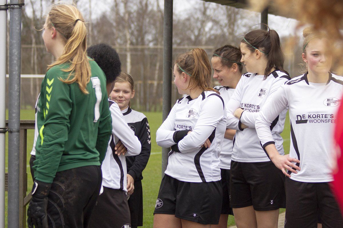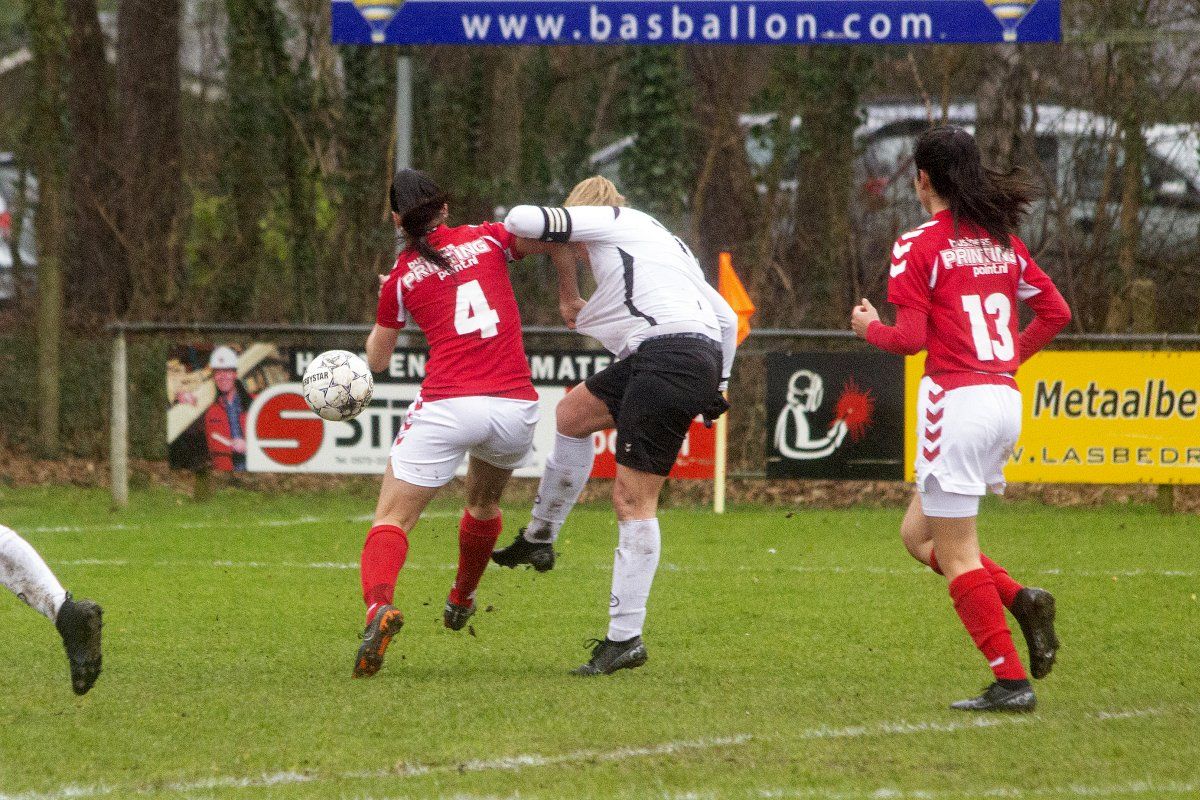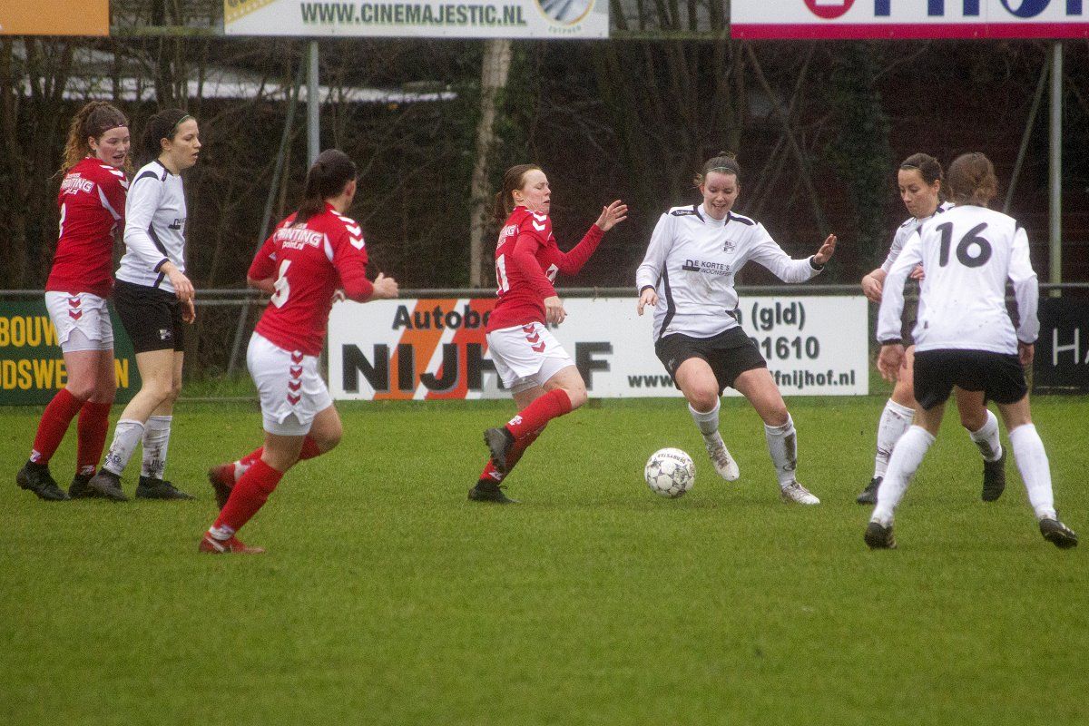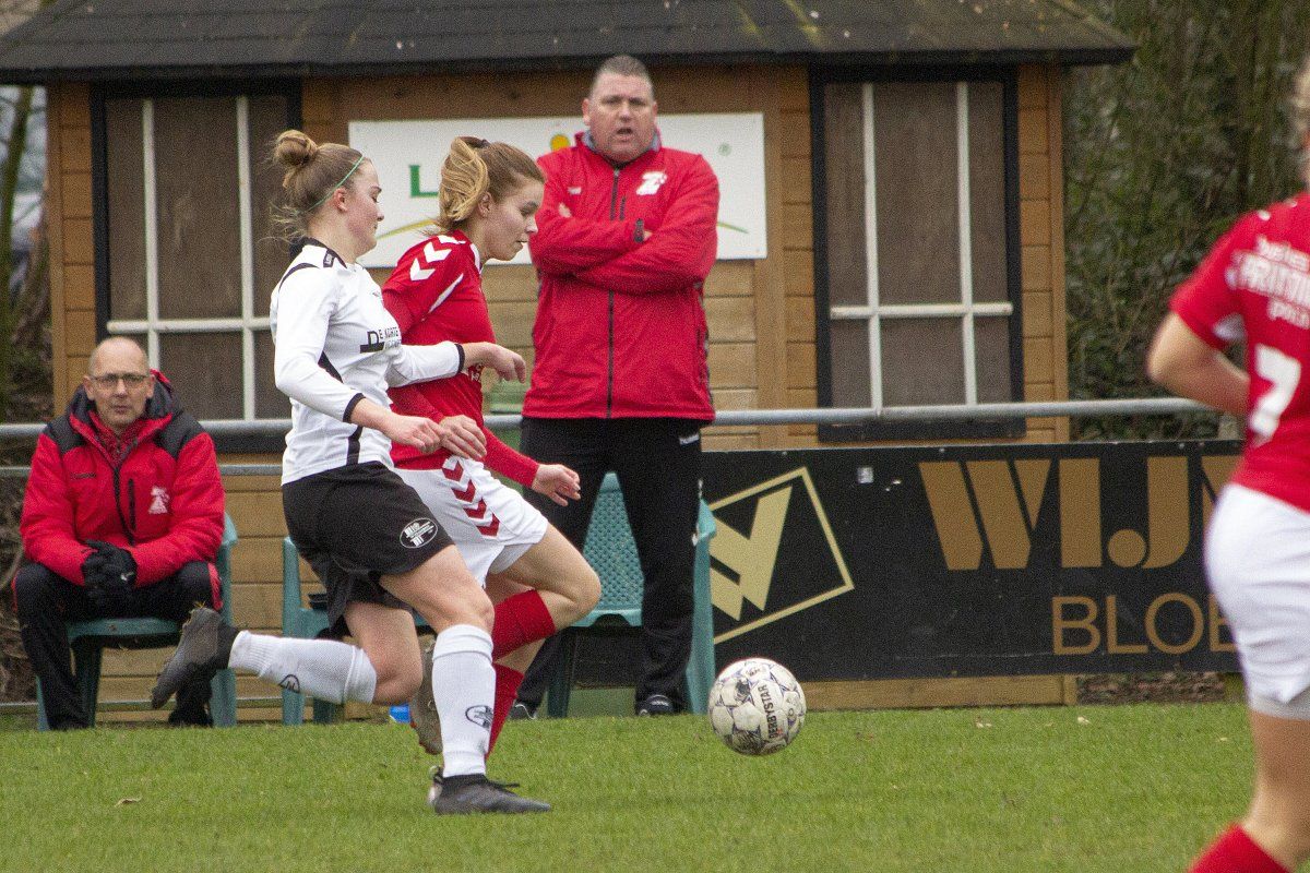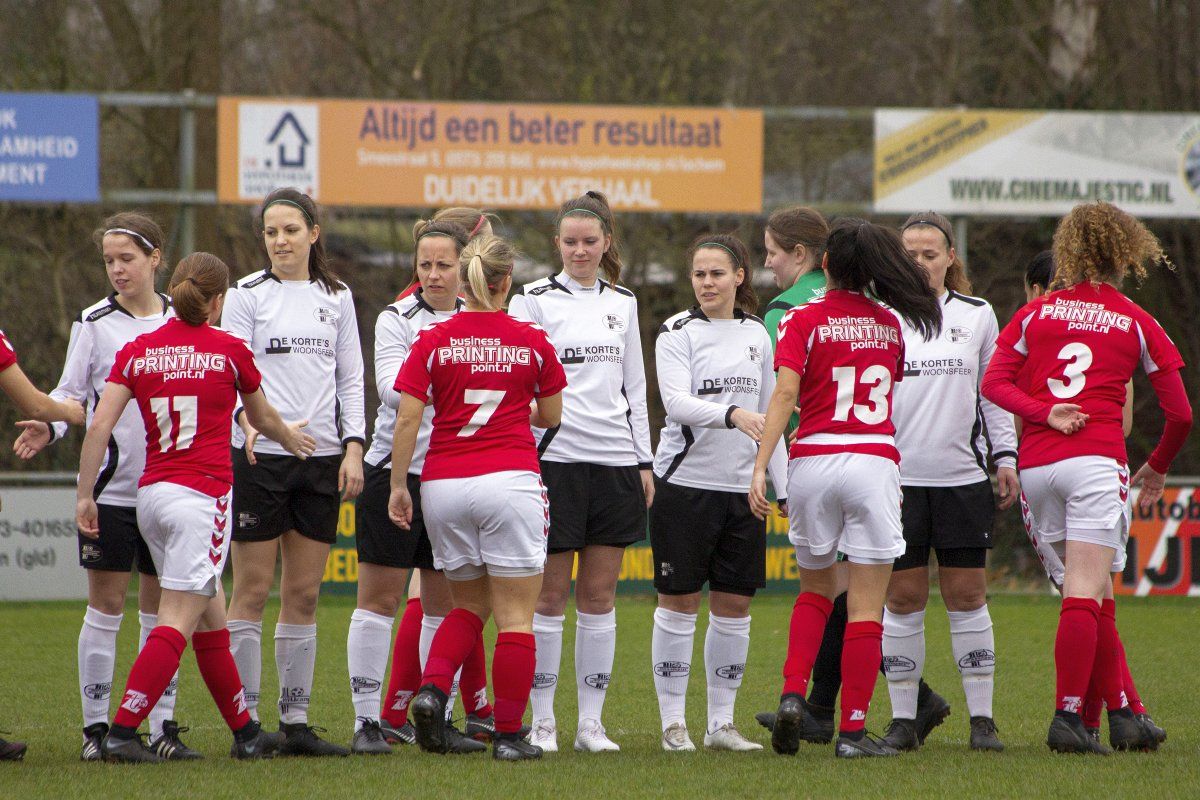 Iets later dan 12:00 uur wordt er afgetrapt. Al snel blijkt dat we niet in ons doen zijn. Er wordt meerdere malen op slordige wijze balverlies geleden, de linies staan te ver uit elkaar, er wordt niet zoals gebruikelijk goed gecombineerd, maar wat vooral ontbreekt is de beleving in ons spel. Desalniettemin zijn de grote kansen voor ons. Vanuit een strakke corner van Daphne wordt Tessa vogelvrij gelaten, maar kopt de bal net over. Niet veel later weet de keepster van ’t Zand een vrije trap knap af te weren en ook was het Tessa die de bal vrij in het zestienmetergebied met haar linker net naast het doel plaatste. Gelukkig weet aanvoerster Marieke in de 30e minuut het net te vinden. Carmilla zoekt onze spits met een lange bal op, de verdedigster weet de bal niet goed uit te verdedigen waardoor Marieke 1 op 1 met de keepster komt te staan en de rust weet te bewaren. Een minuut voor rust komen we met een grote schrik weg. Doordat onze tegenstander het spel snel van links naar rechts weet te verleggen, raken we de kluts kwijt. Vanaf de rechterflank wordt een bal strak over de grond voorgezet en geen van onze verdedigsters weet de bal van richting te veranderen waardoor de bal vrij voor de voeten van de linksbuiten komt. Maar net als vorige week laat onze keepster Anne zien dat zij van onschatbare waarde is en weet op knappe wijze de bal met haar voet uit het doel te houden.