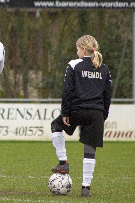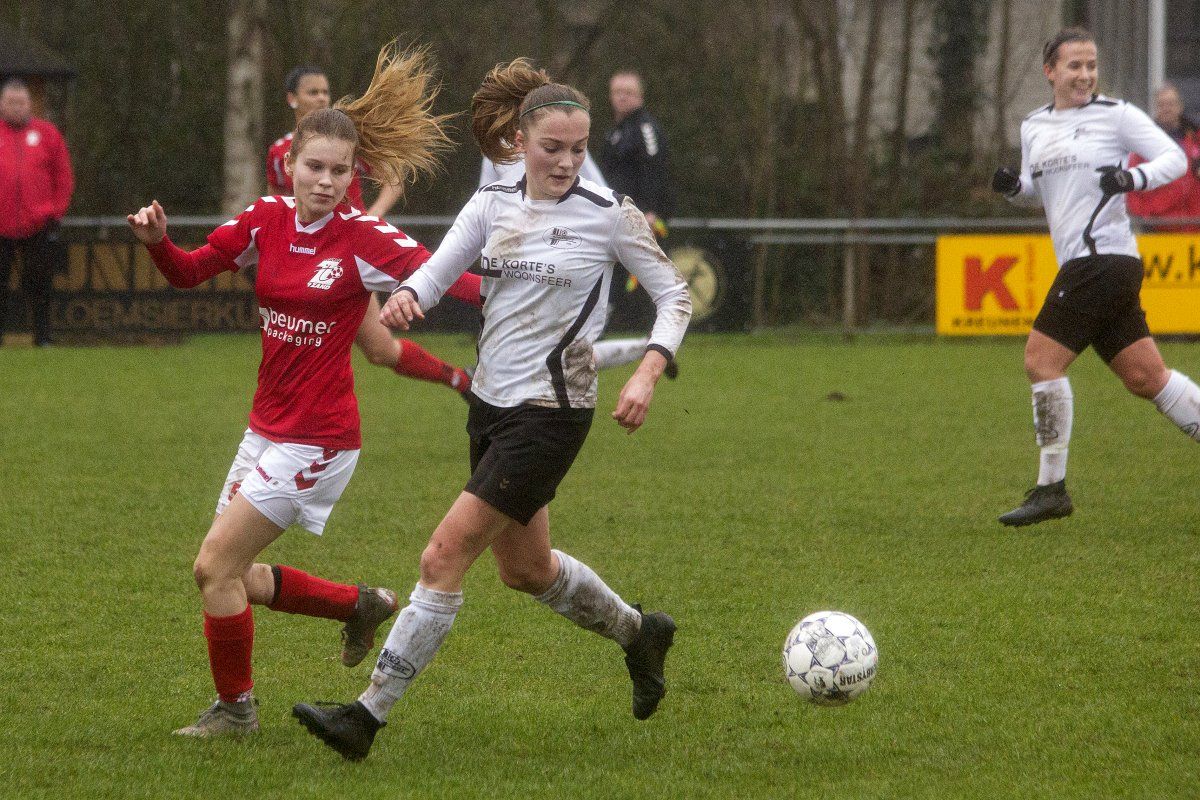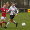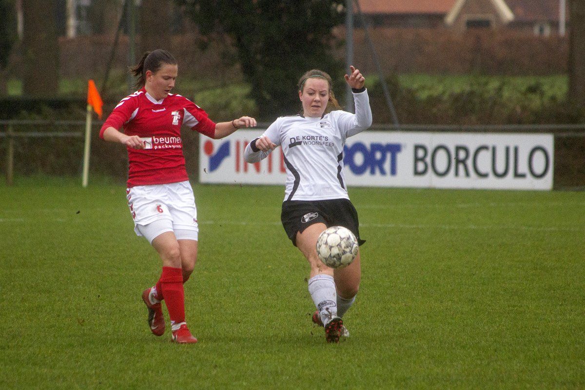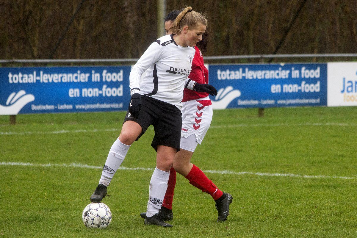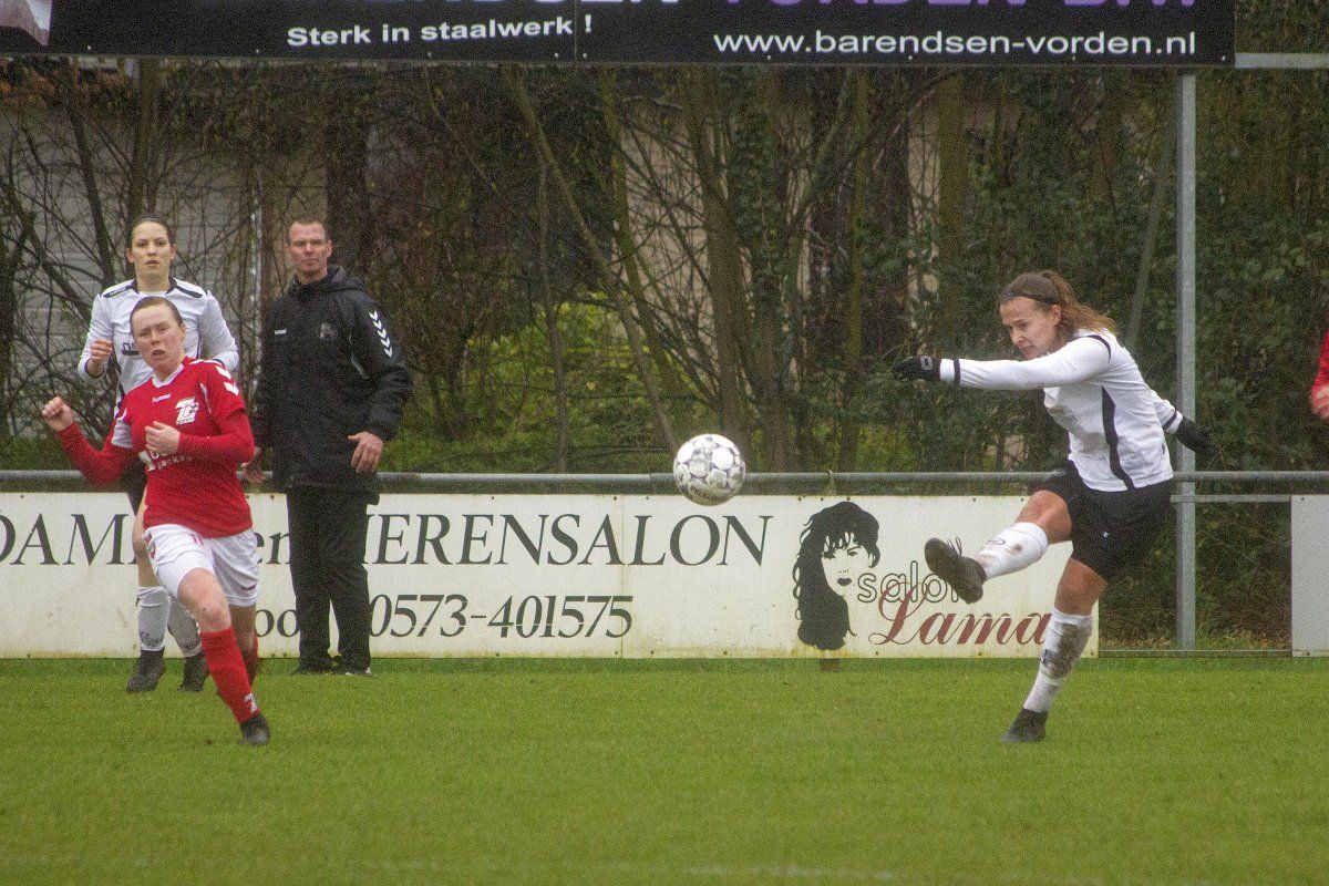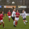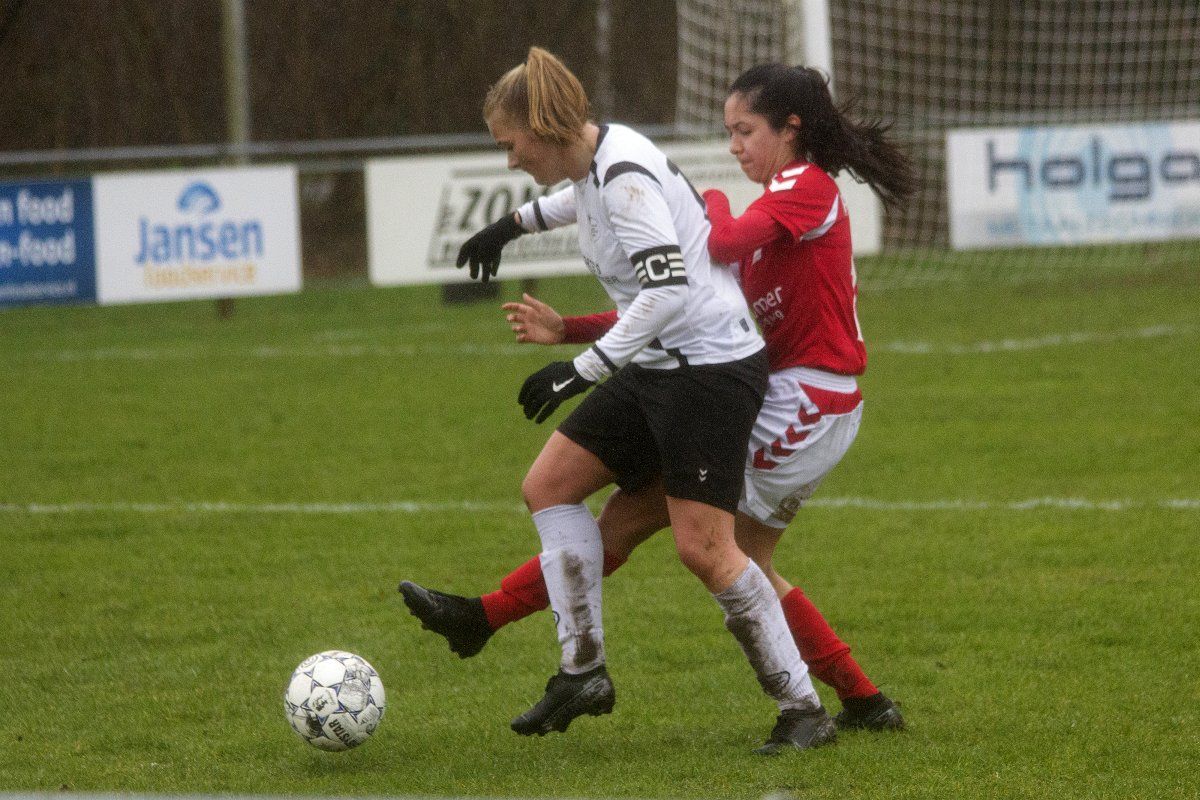 Iets later dan 12:00 uur wordt er afgetrapt. Al snel blijkt dat we niet in ons doen zijn. Er wordt meerdere malen op slordige wijze balverlies geleden, de linies staan te ver uit elkaar, er wordt niet zoals gebruikelijk goed gecombineerd, maar wat vooral ontbreekt is de beleving in ons spel. Desalniettemin zijn de grote kansen voor ons. Vanuit een strakke corner van Daphne wordt Tessa vogelvrij gelaten, maar kopt de bal net over. Niet veel later weet de keepster van ’t Zand een vrije trap knap af te weren en ook was het Tessa die de bal vrij in het zestienmetergebied met haar linker net naast het doel plaatste. Gelukkig weet aanvoerster Marieke in de 30e minuut het net te vinden. Carmilla zoekt onze spits met een lange bal op, de verdedigster weet de bal niet goed uit te verdedigen waardoor Marieke 1 op 1 met de keepster komt te staan en de rust weet te bewaren. Een minuut voor rust komen we met een grote schrik weg. Doordat onze tegenstander het spel snel van links naar rechts weet te verleggen, raken we de kluts kwijt. Vanaf de rechterflank wordt een bal strak over de grond voorgezet en geen van onze verdedigsters weet de bal van richting te veranderen waardoor de bal vrij voor de voeten van de linksbuiten komt. Maar net als vorige week laat onze keepster Anne zien dat zij van onschatbare waarde is en weet op knappe wijze de bal met haar voet uit het doel te houden.