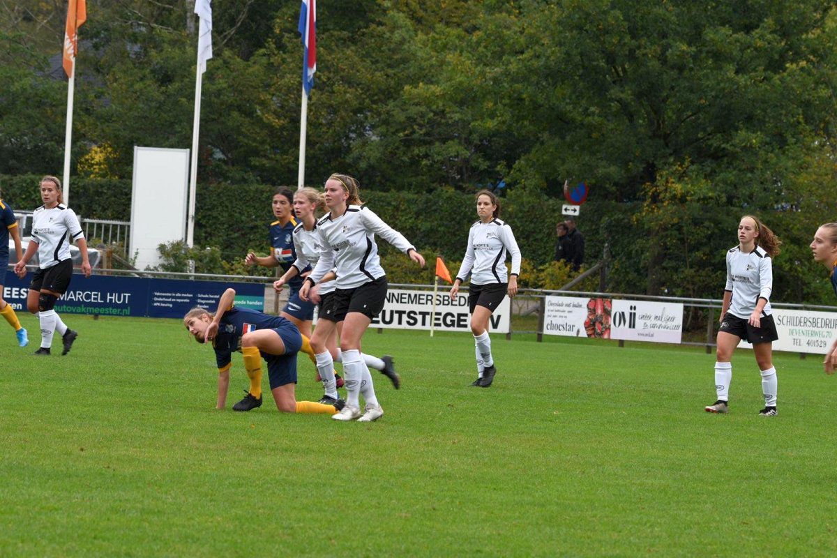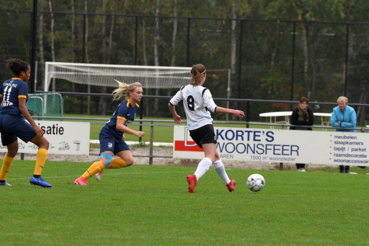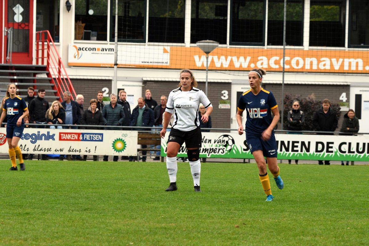 De tweede helft starten we goed en zetten het spel van de laatste twintig minuten voort. In de 65e minuut komen we op voorsprong; Marieke weet het veld goed breed te houden en kan vrij voorzetten, ze weet op perfecte wijze het hoofd van Elisa te vinden die hem alleen maar hoeft aan te tikken, 2-1. Vanaf dat moment gaat Eindhoven steeds meer druk zetten, waardoor wij het een stuk lastiger krijgen. Misschien is het onze fout geweest om terug te lopen, in plaats van juist ook druk vooruit te zetten. We weten deze voorsprong 20 minuten vol te houden, maar helaas staat er in de 85e minuut een 2-2 op het scorebord. Niet vlak daarna wordt Daphne 1 op 1 gezet met de keepster en weet beheerst af te ronden. Helaas zag de grensrechter, tot iedereens verbazing, hier buitenspel in. Nog geen drie minuten later geven we het helemaal weg, Eindhoven komt langszij en dat betekent dat er weer geen punten zijn behaald.