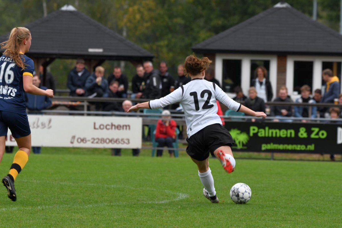 Al snel blijkt dat de Vrouwen uit Eindhoven goed rond kunnen tikken waardoor ze een aantal keren gevaarlijk voor ons doel komen. We komen in de beginfase goed weg maar toch staan we na twintig minuten terecht tegen een 1-0 achterstand aan te kijken. We geven niet op en zetten er allemaal een tandje bij. Er worden meer duels gewonnen en de winnaarsmentaliteit die vorige week ontbrak, kwam naar boven. Nog geen minuut voor rust resulteerde dit in een vrije trap, ongeveer 25 meter verwijderd van het doel. Tessa stapt achter de bal en schiet vol overtuiging de 1-1 (in de kruising) binnen. Dit op het juiste moment, want de scheids fluit gelijk om te rusten.