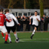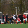 Vandaag is de eerste kans van de wedstrijd voor Reünie. Op een schot vanaf de rand van het zestienmetergebied moet Joost Pakkert gelijk reageren. Het blijft bij een klein schrikmomentje voor Witkampers dat daarna nog maar heel weinig weggeeft. In het eerste kwartier van de wedstrijd gaat het nog redelijk gelijk op. Zowel Reünie als Witkampers tasten een beetje af en er gebeurt niet heel veel. Na deze wat afwachtende openingsfase nemen de Larenaren het initiatief steviger in handen. Witkampers is comfortabel in balbezit, wint de meeste duels en een spaarzame Borculose uitval wordt prima tegengehouden. Dit spelbeeld zorgt in de eerste helft nog niet voor echte kansen. Je voelt bijna dat een goal wel in de lucht hangt, af en toe komt Witkampers ook wel in de buurt van het Reünie doel, maar nog niet voldoende voor een voorsprong.
